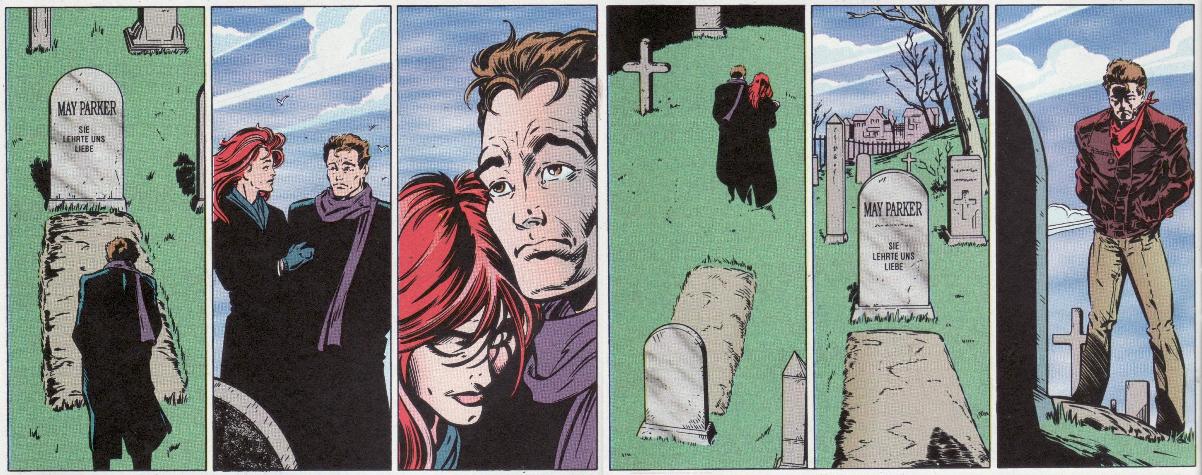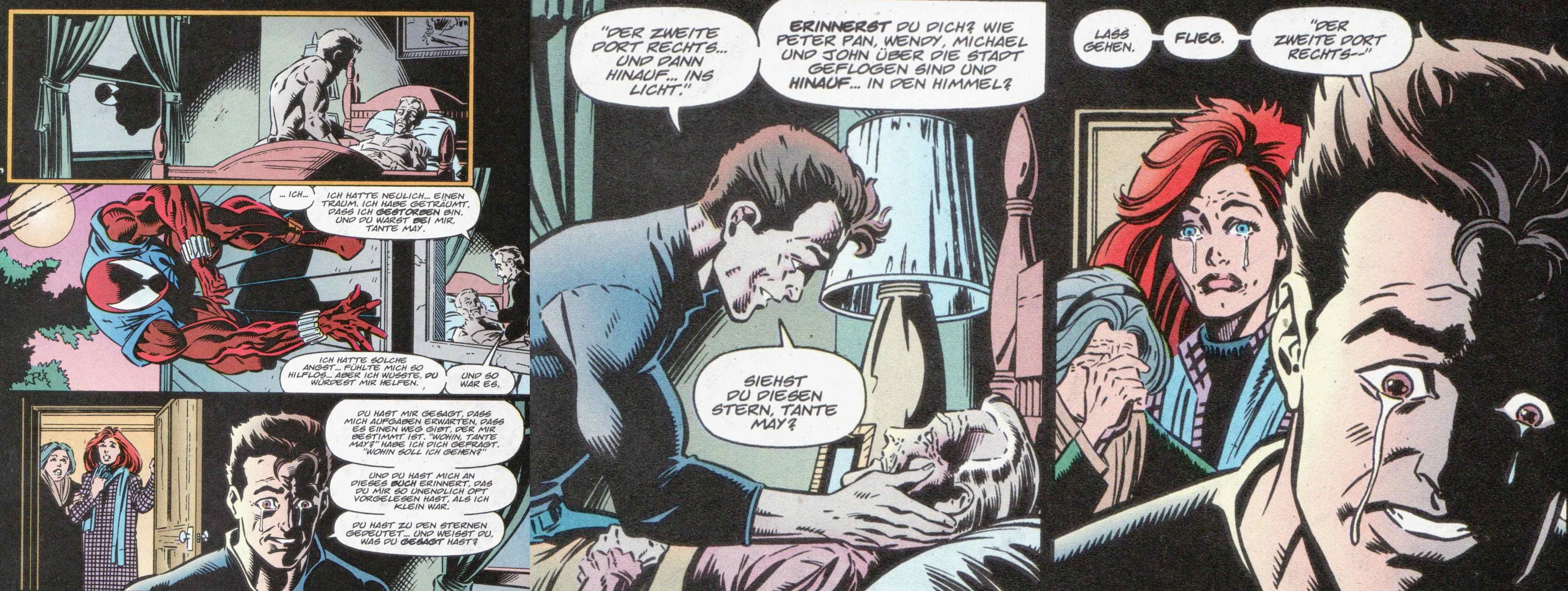 Abends zu Hause geschieht dann das unvermeidliche. Tante May entschläft in ihrem Bett an der Seite ihres Neffen Peter, während er ihr aus Peter Pan zitiert. In genau diesem Moment betreten auch Mary Jane und Anna Watson den Raum und sofort liegt der Verlust eines geliebten Menschen spürbar innerhalb und ausserhalb dieses Hauses des Friedens und der Standfestigkeit im Leben der Parkers…