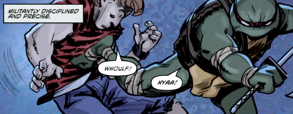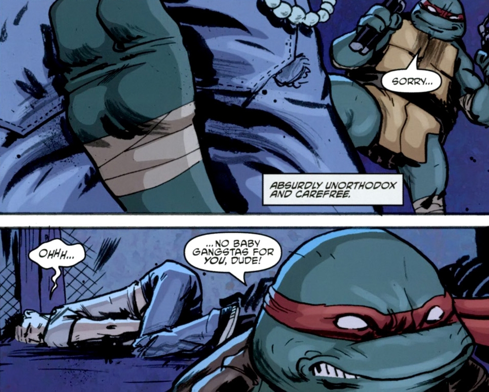 Als diese jedoch an einem Haus vorbeikommt und dort einen handfesten Streit zwischen einem Jungen und seinem Vater mitbekommt muss sie einschreiten. Der Turtle tritt die Tür ein und legt sich auch sofort mit dem Vater an der seinen Jungen offenbar verprügeln will. Nach einem kurzen aber heftigen Fight flüchtet der Vater und lässt seinen Sohn mit diesem mutierten Etwas alleine zurück.