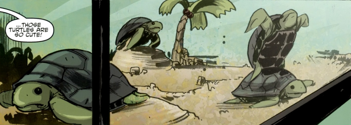 Die gerade neu zum Team dazu gestossene und vollkommen unbedarfte April O’Neil wird in ihr Aufgabengebiet eingewiesen und den kleinen süßen Schildkröten vorgestellt. Ab sofort hat sie auch die Verantwortung über diese kleinen Wesen und ihre erste Aufgabe ist es ihnen Futter zu geben.