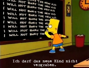 It’s Mittwoch. 😀 Und hier ist der neue Simpsons-Tafelgag. Diesmal machen wir wegen der alljährliche Halloween-Episode wieder einen kleinen Sprung. Denn wie üblich enthält die Folge, mit dem schönen Titel „Bösartige Spiele (Treehouse of Horror III)“ (9F04), die 12. 05. 1994 am Deutschlandpremiere und am 29. 10. 1992 US-Premiere feierte, keinen Tafelgag.