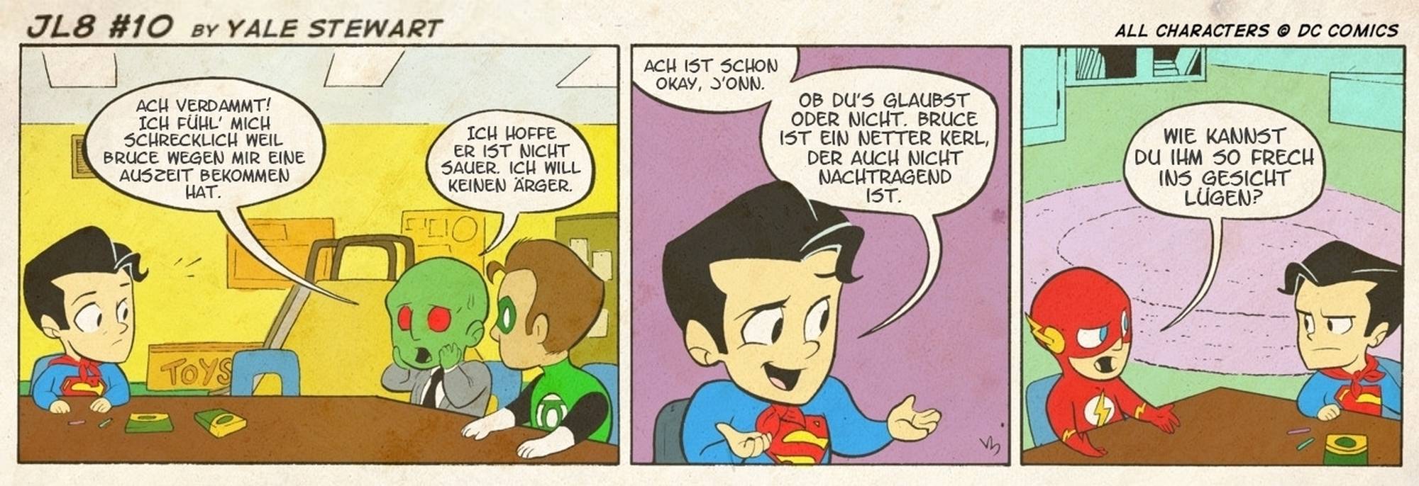 Sept 10 2012 JL8 Episode #10 Während Batman hinter seiner Trennwand eine Auszeit nimmt, macht sich der arme J’onn tierische Vorwürfe … Viel Spaß damit! (für eine größere Ansicht auf das Bild klicken) Characters © DC Comics, Creative content © Yale Stewart. JL8 im Web: Tumblr, Facebook, Twitter © 2012 Copyright der Übersetzung by „Mueli77’s Feine Welt“. Jegliche Weiterverwendung ohne ausdrückliche Genehmigung untersagt. Bewerten:Teilen: Klicken, um auf WhatsApp zu teilen (Wird in neuem Fenster geöffnet) WhatsApp Tweet Klicken, um einem Freund einen Link per E-Mail zu senden (Wird in neuem Fenster geöffnet) E-Mail Klicken zum Ausdrucken (Wird in neuem Fenster geöffnet) Drucken Auf Tumblr teilen Klick, um auf Reddit zu teilen (Wird in neuem Fenster geöffnet) Reddit Klicken, um auf Telegram zu teilen (Wird in neuem Fenster geöffnet) Telegram Pocket Zum Teilen auf Mastodon klicken (Wird in neuem Fenster geöffnet) Mastodon Zum Teilen auf Nextdoor hier klicken (Wird in neuem Fenster geöffnet) Nextdoor Gefällt mir Wird geladen … Ähnliche Beiträge