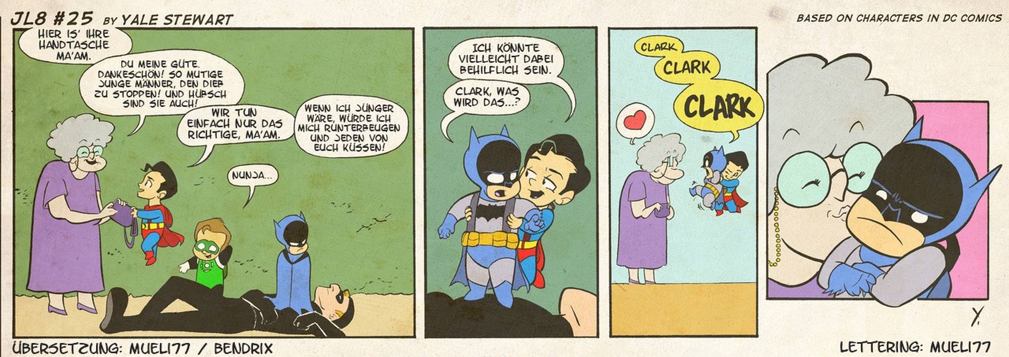Heute morgen habe ich euch beim Simpsons-Tafelgag noch eine Weihnachtsüberraschung versprochen und hier kommt sie auch schon. Nein. Der JL8 Strip ist nicht die Weihnachtsüberraschung, sondern die Tatsache, das die JL8 ab sofort zweimal die Woche auf diesem Blog aufschlägt. Denn genau wie beim Original ist ab sofort der Montag und der Donnerstag JL8-Tag! Deshalb heißt es diesmal nicht „Bis nächste Woche“, sondern nur „Bis Donnerstag“. Aber heute haben wir erstmal Weihnachten und darum wünsche ich euch allen Frohe Weihnachten mit dem neuen Strip der ausgezeichneten Webcomicserie 2012.