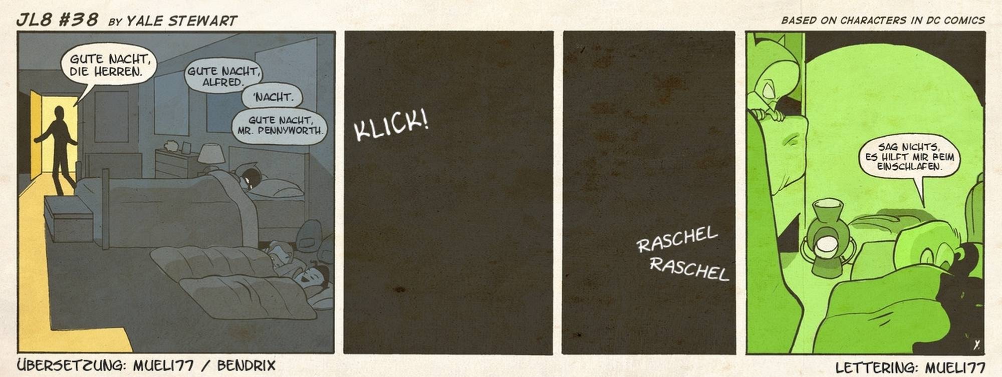 Feb 7 2013 JL8 Episode #38 Batman ist die Dunkelheit ja gewohnt, aber das Hal so seltsame Rituale hat…? Viel Spaß damit! (für eine größere Ansicht auf das Bild klicken) Characters © DC Comics, Creative Content © Yale Stewart. JL8 im Web: Tumblr, Facebook, Twitter © 2013 Copyright der Übersetzung by „Mueli77’s Feine Welt“. Jegliche Weiterverwendung ohne ausdrückliche Genehmigung untersagt. Teilen: Klicken, um auf WhatsApp zu teilen (Wird in neuem Fenster geöffnet) WhatsApp Tweet Klicken, um einem Freund einen Link per E-Mail zu senden (Wird in neuem Fenster geöffnet) E-Mail Klicken zum Ausdrucken (Wird in neuem Fenster geöffnet) Drucken Auf Tumblr teilen Klick, um auf Reddit zu teilen (Wird in neuem Fenster geöffnet) Reddit Klicken, um auf Telegram zu teilen (Wird in neuem Fenster geöffnet) Telegram Pocket Zum Teilen auf Mastodon klicken (Wird in neuem Fenster geöffnet) Mastodon Zum Teilen auf Nextdoor hier klicken (Wird in neuem Fenster geöffnet) Nextdoor Gefällt mir Wird geladen …