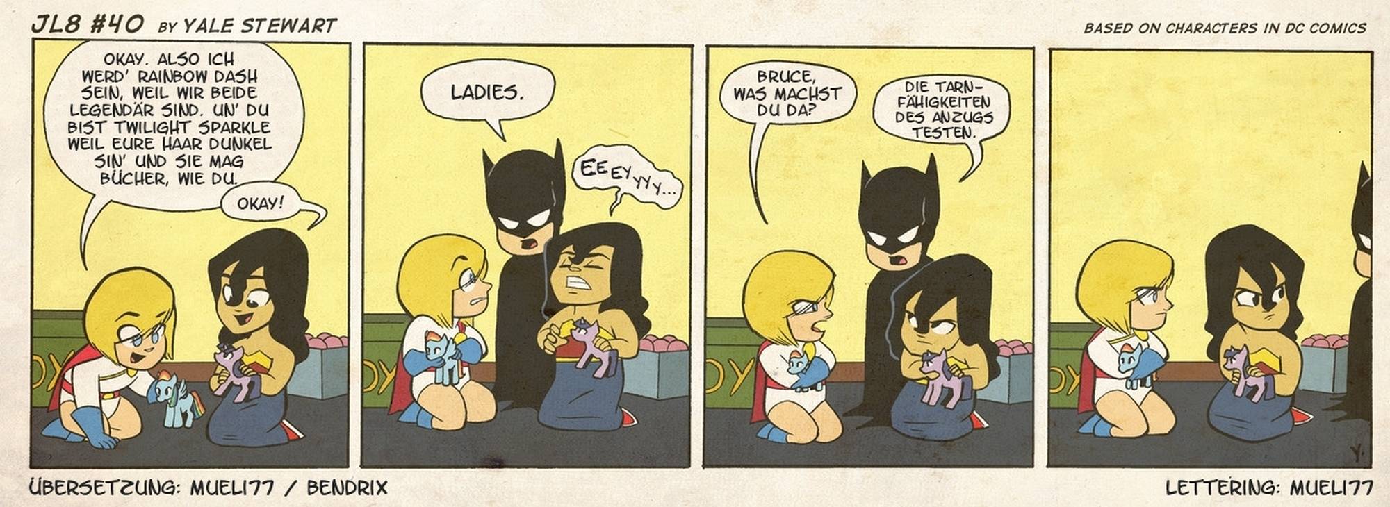 Feb 14 2013 JL8 Episode #40 Neue Anzüge bringen auch neue Möglichkeiten mit sich. Aber wie sinnvoll sind diese…? Viel Spaß damit! (für eine größere Ansicht auf das Bild klicken) Characters © DC Comics, Creative Content © Yale Stewart. JL8 im Web: Tumblr, Facebook, Twitter © 2013 Copyright der Übersetzung by „Mueli77’s Feine Welt“. Jegliche Weiterverwendung ohne ausdrückliche Genehmigung untersagt. Teilen: Klicken, um auf WhatsApp zu teilen (Wird in neuem Fenster geöffnet) WhatsApp Tweet Klicken, um einem Freund einen Link per E-Mail zu senden (Wird in neuem Fenster geöffnet) E-Mail Klicken zum Ausdrucken (Wird in neuem Fenster geöffnet) Drucken Auf Tumblr teilen Klick, um auf Reddit zu teilen (Wird in neuem Fenster geöffnet) Reddit Klicken, um auf Telegram zu teilen (Wird in neuem Fenster geöffnet) Telegram Pocket Zum Teilen auf Mastodon klicken (Wird in neuem Fenster geöffnet) Mastodon Zum Teilen auf Nextdoor hier klicken (Wird in neuem Fenster geöffnet) Nextdoor Gefällt mir Wird geladen …
