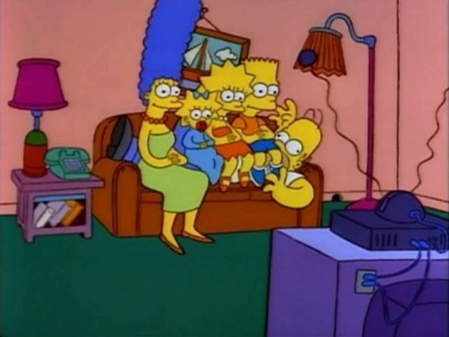 Homer liegt auf der Couch, als der Rest der Familie hereingerannt kommt. Ohne Rücksicht setzen sich alle auf die Couch, auf der noch immer Homer liegt.