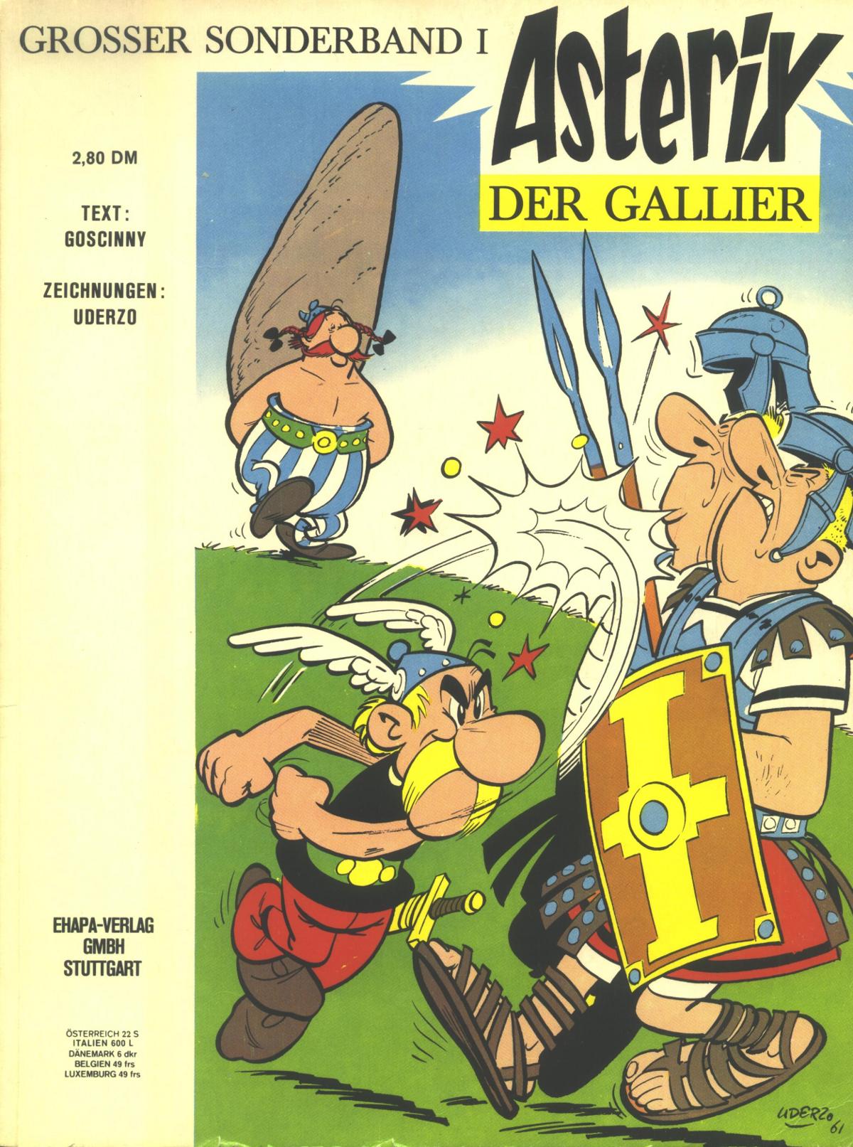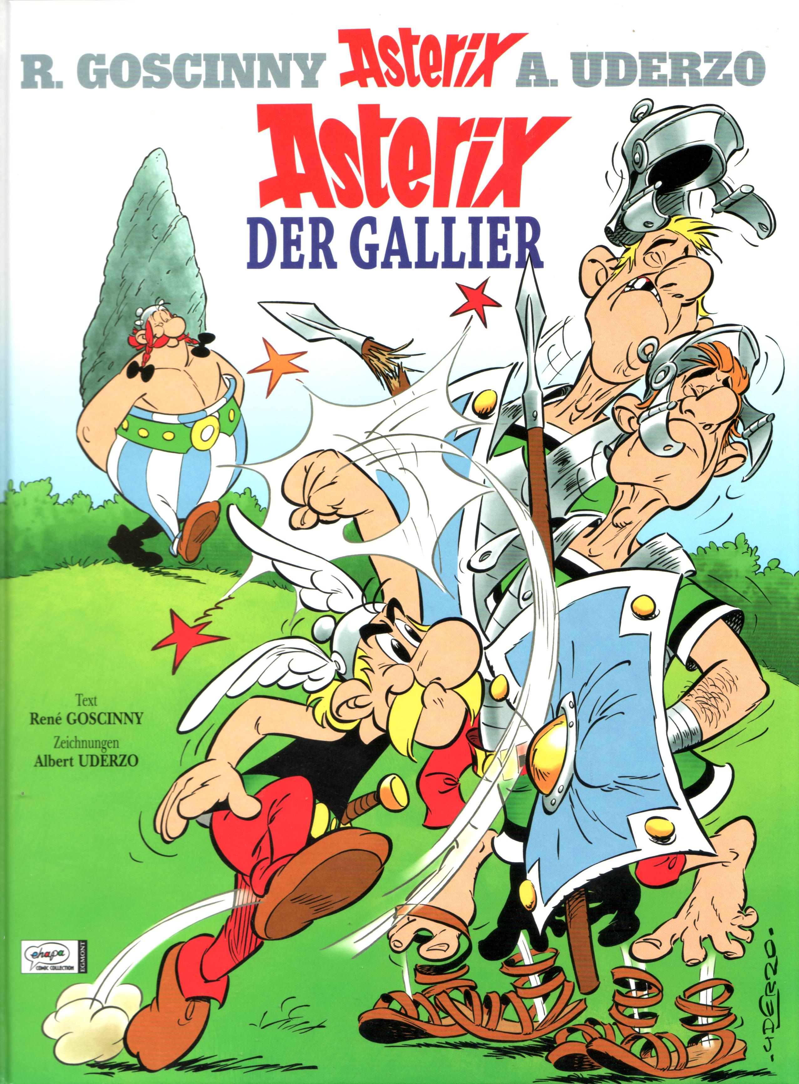 Asterix der Gallier gehört zu eben jenen Ausgaben, welchen ein komplett neues Cover spendiert wurde. Im direkten Vergleich sieht man sehr gut, dass in dem neuen Cover wesentlich mehr Dynamik steckt. Durch das verbogene Schild, die aus den Sandalen gehoben Legionäre, sowie deren nach hinten gezogene Köpfe, wirkt Asterix‘ Schlag wesentlich kräftiger als auf dem Originalmotiv. Auch Obelix‘ Gang ist wesentlich leichtfüßiger und nicht so behäbig, wie auf dem früheren Motiv.