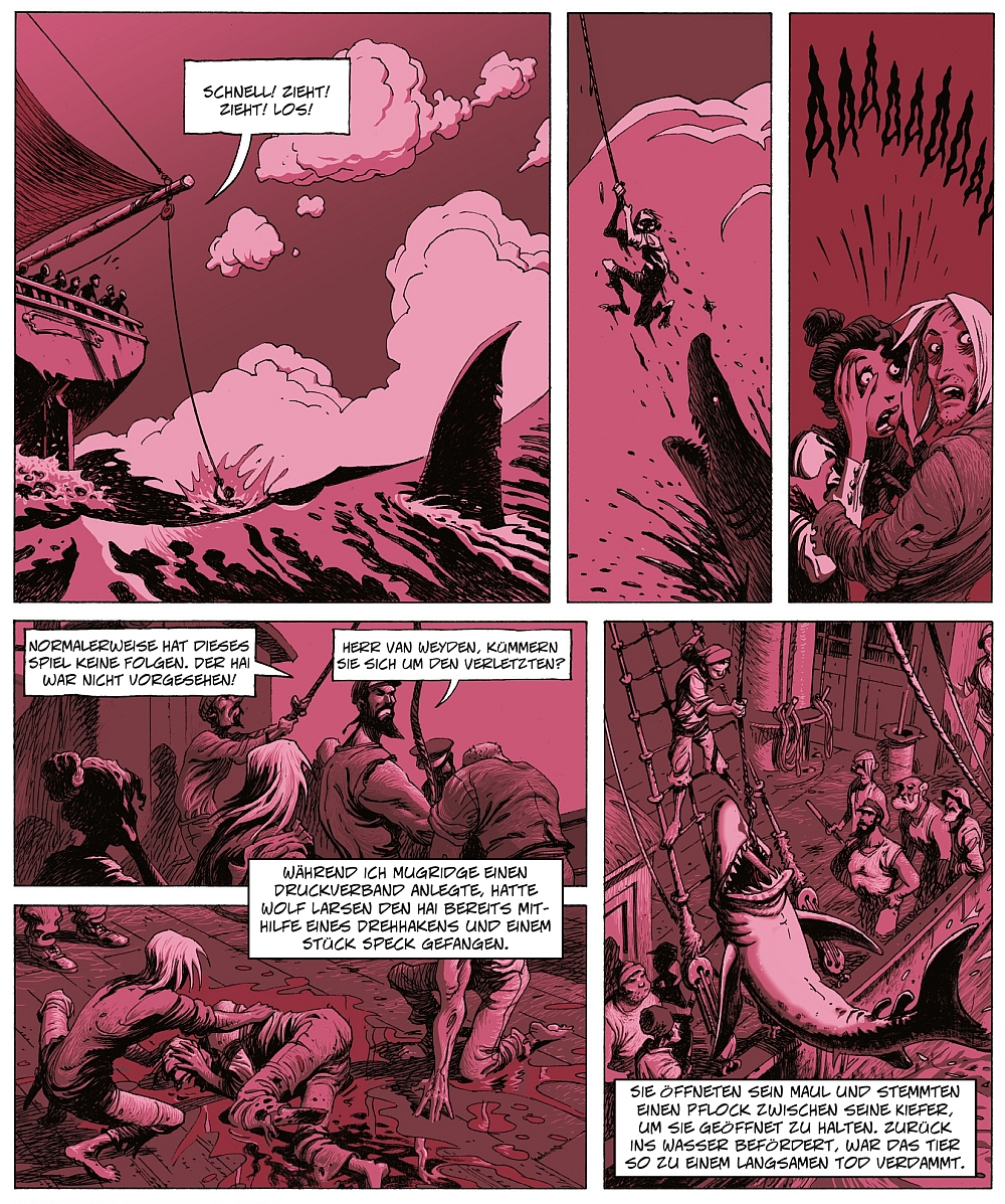Wenn man es genau nimmt, sind Romanadaptionen immer eine zweischneidige Sache. Entweder sie treffen das Vorbild sehr gut, und es wird ihnen die Eigenständigkeit abgesprochen, oder sie versuchen das Vorbild frei wiederzugeben und sind dann letztendlich zu weit vom Original entfernt, sodass der Kenner der Vorlage enttäuscht ist. In diesem Fall aber hat Riff Reb’s, nach meinem persönlichen Geschmack, genau die richtige Wahl getroffen. Heraus gekommen ist ein dramatisches Werk mit atemberaubendem Artwork, das fasziniert. Sein fast schon „grobschlächtiges“ Design, das dennoch mit sehr vielen Details aufwartet, fängt die Stimmung perfekt ein und verkörpert so auch ein wenig den Charakter des Kapitäns Wolf Larsen.