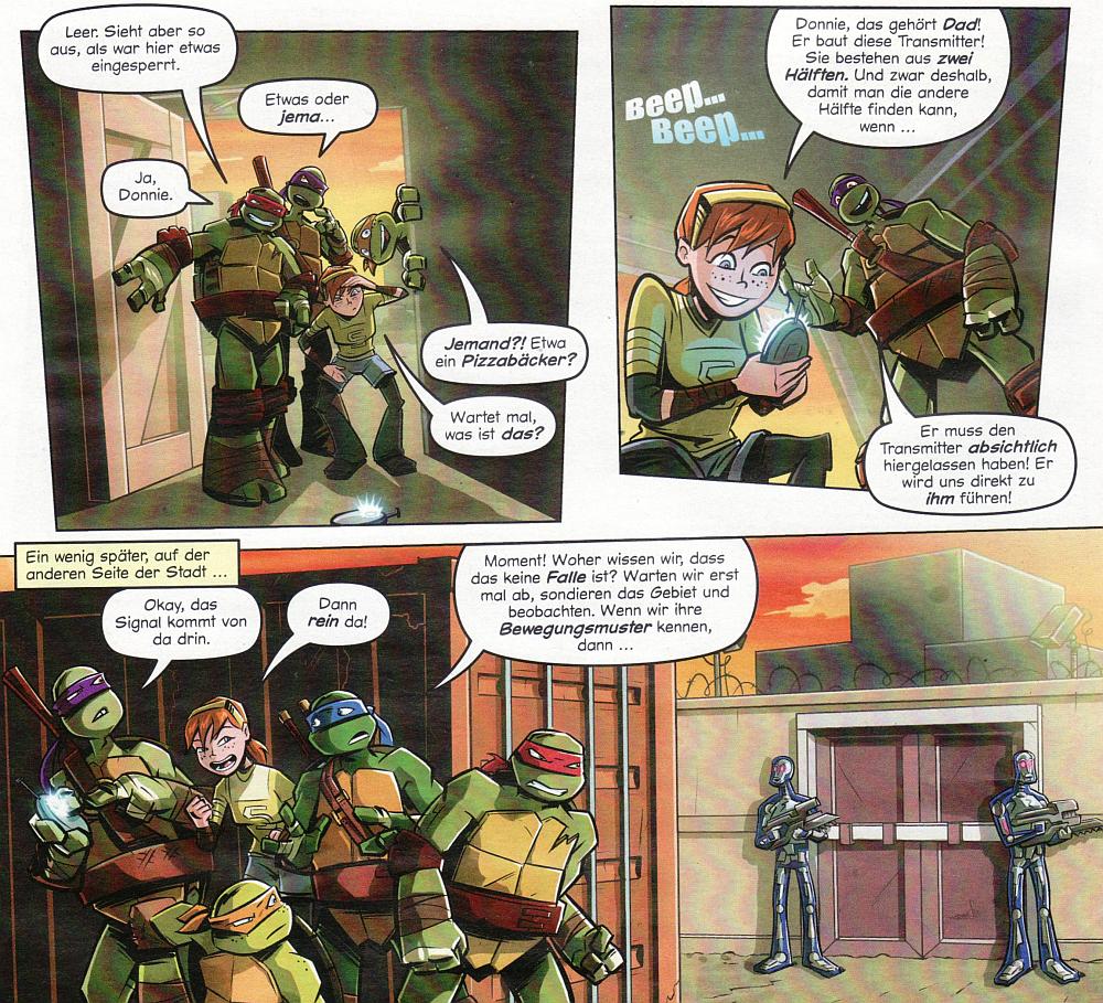 Das sich dafür die Handlungen von Ed Caruana, John-Paul Bove und Landry Walker, anders als in der TV-Serie, eher dürftig und kurzweilig gestaltet, steht dagegen auf einem andern Blatt. Während sich die Turtles in der ersten enthaltenen Geschichte darum kümmern, ihre Pizzas sicher nach Hause zu bringen, müssen sie so ganz nebenbei kleine Kätzchen retten, alte Damen vor Räubern beschützen oder die Purple Dragons aufzuhalten versuchen. Die zweite Story dreht sich dagegen um April und ihren Vater, welchen die Turtles versuchen aus den Klauen der Kraang zu befreien. Hier fällt auf, dass die Geschichte ganz lose der Serie folgt. Man könnte die enthaltenen Geschichten daher als eine Art Zwischenspiel zur Serie ansehen.