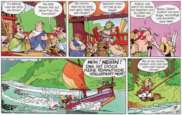 Neben all den Anspielungen, gib es aber auch wieder einen inzwischen liebgewonnenen Running-Gag, der hier seinen Ursprung hatte. Denn in diesem Abenteuer wurde Obelix erstmal mit seinem Figurproblem konfrontiert. Wer erinnert sich nicht an Obelix‘ impulsiven Ausspruch: „Dick? Wer ist hier Dick?“ Auch wenn es hier noch ein wenig weiter getrieben wird, und Obelix sogar als dickes Monstrum bezeichnet. Und es gibt erneut ein Aufeinandertreffen mit den Piraten. Diesmal ist sogar Baba, der dunkelhäutige Späher im Krähennest des Piratenschiffes anwesend. Wie das ausgeht, kann man sich allerdings denken …