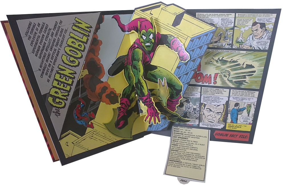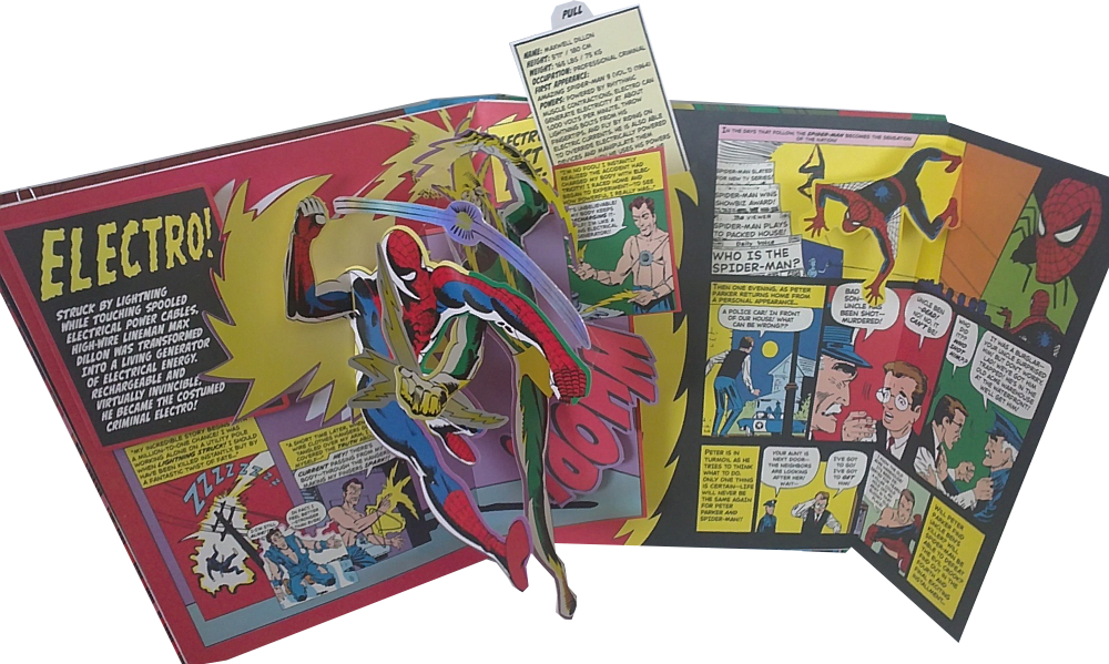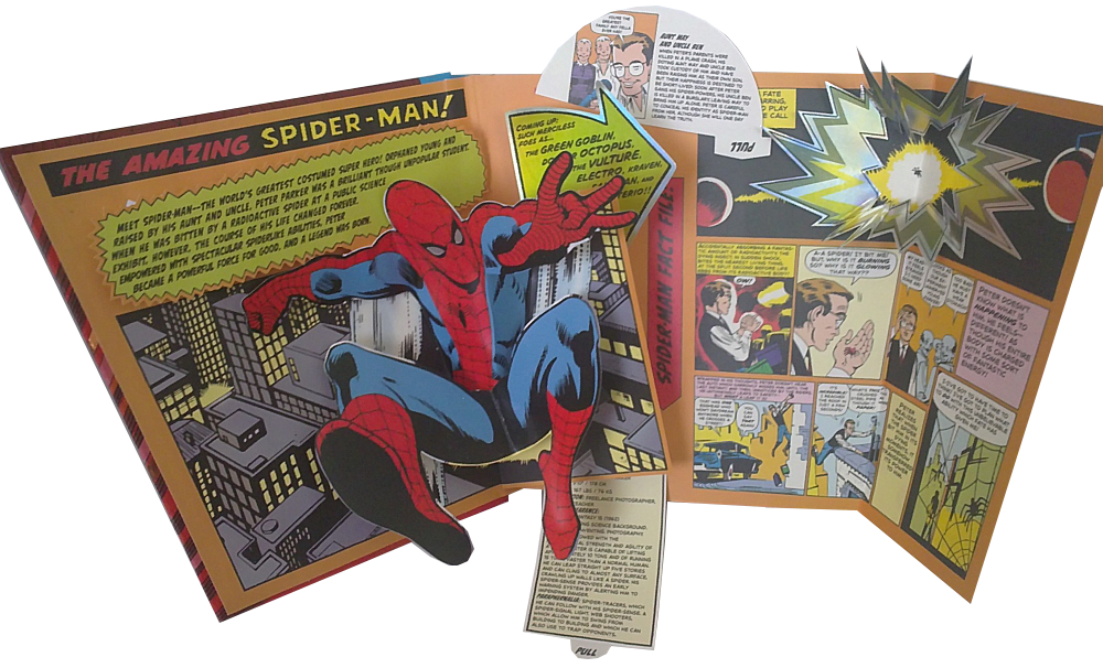Spider-Man. Der Held des Buches. Hier wird geschildert, wie alles begann. Im Zentrum stehen neben dem großen herauspoppenden Spider-Man natürlich auch die zusätzlichen Infos, die herausgezogen (unterhalb des Buches) und gedreht (oberhalb) werden können.