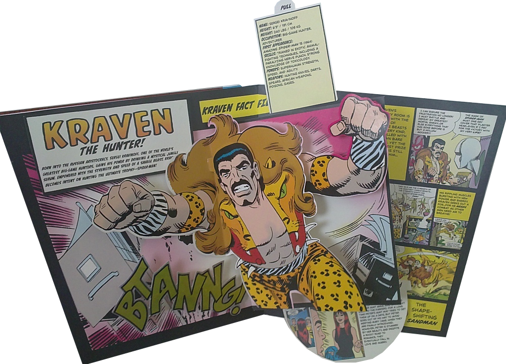 Ein weiterer Schurke ist Kraven. Auch ihm wurde eine Doppeseite gewidmet und er darf sie auch ganz für sich alleine haben. Wieder ergänzt mit ausklappbaren und herausdrehbaren Zusatzinfos.