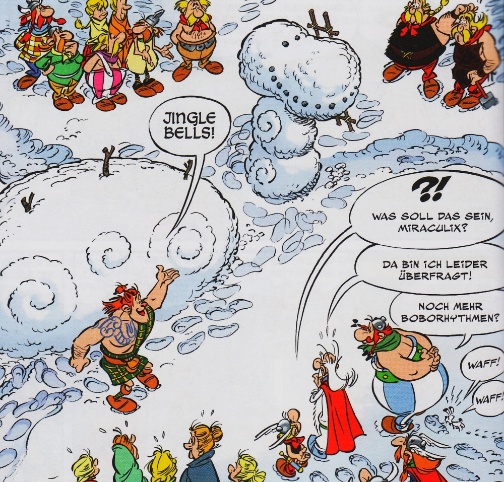 Jean-Yves Ferri erschafft ein humorvolles und spannendes Abenteuer, welches sich nicht vor den frühen Ideen von Goscinny und Uderzo zu verstecken braucht. Er integriert dabei nicht nur klassischen Humor und geschichtliche Ereignisse, sondern schafft es gleichzeitig auch, der aktuellen Popkultur ihren Tribut zu zollen. Während sich die Handlung im ersten Teil des Bandes gemächlich aufbaut, und man sich als Leser behutsam dem neuen, leicht anderen und dennoch irgendwie bekannten Stil annähern kann, zeigen sich auch innerhalb des von Ferri geschilderten Dorfes Veränderungen. Sei es ein römischer Volkszähler, der fast zur Weißglut gebracht wird, oder den Reiz der schottischen Kleidung auf die weiblichen Bewohner. Solche Kleinigkeiten, die sich dann auch noch über das gesamte Abenteuer ziehen, finden sich zuhauf in diesem neuen Band. Ab etwa der Hälfte beginnt dann das eigentliche Abenteuer. Die Geschichte nimmt an Fahrt auf, ohne dabei gehetzt zu wirken, und auch hier bauen die beiden neuen Köpfe viele Gags ein. Besonderes Augenmerk scheint Ferri hierbei auf britische und schottische Eigenheiten, sowie deren Popmusik gelegt zu haben. So tauchen in den gestammelten Sätzen von Mac Aphon immer wieder Titel und Texte von verschiedenen Musikern und Bands auf, wie zum Beispiel von den Beatles.