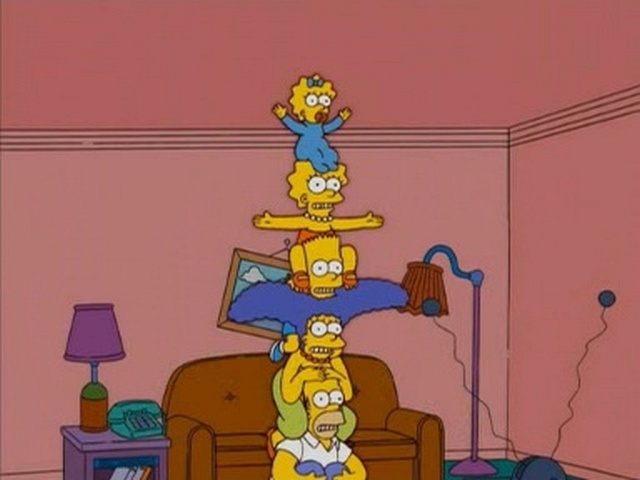 Die Simpsons kommen in Eishockey-Outfits in das Wohnzimmer, umkreisen einmal die Couch und stellen sich dann in Siegerpose davor auf.