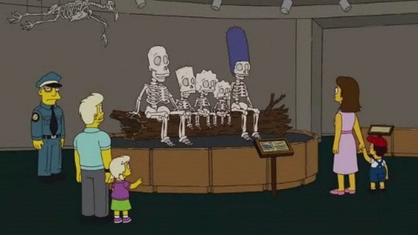 Urzeitliche Versionen der Simpsons setzen sich auf einen Baumstamm. Dieser versinkt und viele Jahrmillionen später finden sich die Skelette im Museum wieder.