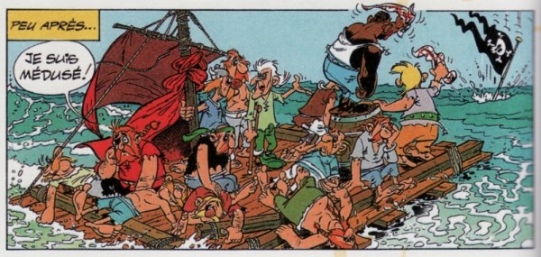 Aber neben den üblichen Lateinwortspielen findet sich auch eine Anspielung auf das Gemälde „Das Floß der Medusa“ von Théodore Géricault in diesem Band. Denn wie so oft in der Historie von Asterix, treffen die Gallier auch diesmal wieder auf die Piraten, welche aber diesmal nicht mit ihrem Boot untergehen, sondern auf einem Floß ihr Heil finden können. Während dies in der deutschen Fassung mit „…hen“ (als Abschluss auf den Ausruf „Fliehen“) übersetzt wurde, heißt es im Original „Je suis Médusé!“ („Ich bin sprachlos“).