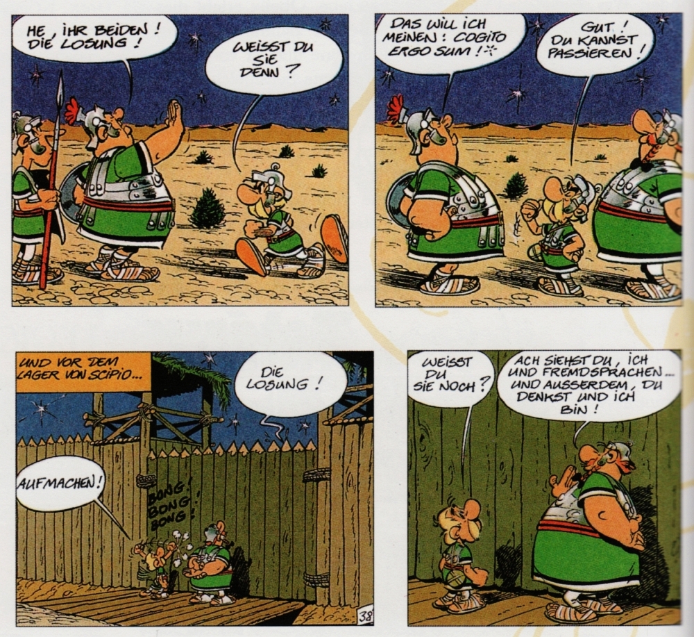Auf die vielen lateinischen Anspielungen in Asterix, insbesondere in „Asterix als Legionär“, und seine dadurch großen Kenntnisse in Latein angesprochen, entgegnete Goscinny, dass er diese Zitate aus den rosa Seiten in Petit Larousse bezieht. Im Gegenteil, er erhalte sogar immer wieder Briefe, in denen auf diverse Lateinfehler hingewiesen würde. Neben Petit Larousse bediente sich Goscinny aber auch bei Moliéres „Der eingebildete Kranke“ und René Descartes „Principia Philosophiae“.