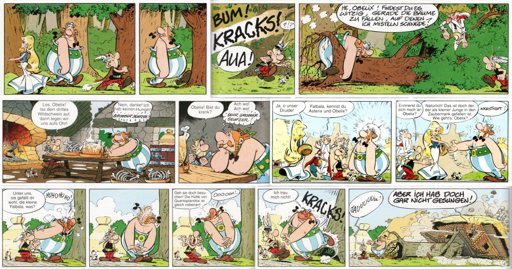Neben dem ganzen Wortwitz und den vielen Anleihen steuert auch Uderzo seinen typischen Humor in fast jedem Panel bei. Obelix entwurzelt in seinem Liebeswahn wiederholt Bäume, inklusive Troubadix‘ Baumhaus, was Idefix seit dem letzten Band nicht so gut verkraftet. Sowieso spielen in diesem Band Mimik und Gestik eine ganz große Rolle in diesem Abenteuer. Erst recht dann, wenn es um den verliebten Obelix geht. Hier fährt Uderzo fast sein gesamtes Arsenal an zeichnerischem Können auf. Wenn man es ganz genau nimmt, dann könnte man den Band auch gut ohne den Text verstehen, da sowohl die Körpersprache als auch die Gesichtsbewegungen von Uderzo so feinfühlig dargestellt werden, dass eine Fehlinterpretation kaum möglich ist.