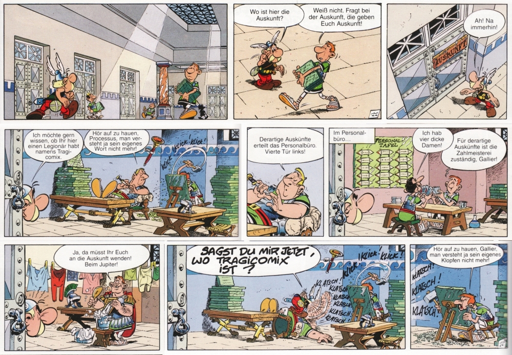 Die Liebe als Ausgangssituation für ein spannendes Abenteuer. Goscinny findet aber auch immer wieder einen Grund, um seine Gallier durch die ganze Welt zu schicken. Interessant ist aber auch, dass sich in diesem Band bereits der Ruf der „unbeugsamen“ Gallier schon so weit herumgesprochen hat, dass römische Patrouillen die den Wald um das Dorf observieren, keinen Wert darauf legen, auf eben jene zu treffen. Und auch die Piraten versuchen tunlichst, den beiden Galliern aus dem Weg zu gehen. Einen weiteren Punkt den Goscinny hier aufgreift ist der römische Amtsschimmel. Nachdem Asterix und Obelix in Condate angekommen sind, um Tragicomix ausfindig zu machen, müssen sie sich durch die komplette Kommandatur quälen, nur um am Ende dort anzukommen, wo sie angefangen haben. Bereits damals hat jeder die Zuständigkeit für eine Aufgabe, auf andere Personen abgewälzt. Dies zeigt, dass Asterix in vielen Punkten auch heute noch aktuell ist. Außerdem schlägt der Autor mit der Auswahl an Mitstreitern in der 1. Legion, 3. Kohorte, 2. Manipel, 1. Zenturie, der auch Asterix angehört, einen Bogen zu vorangegangenen Abenteuern. Denn neben den beiden Gallerin finden sich dort ein Ägypter, ein Engländer und ein Gote. Aber auch kleine Ausblicke auf zukünftige Abenteuer gibt es mit einem Griechen und einem Belgier. Asterix ist und bleibt Mulitkulturell.