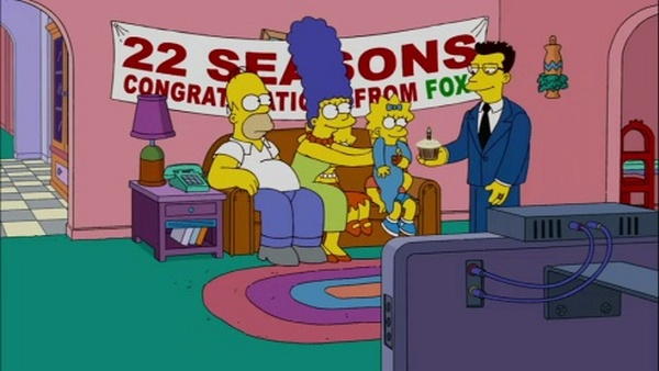 Über den Simpsons und der Couch gratuliert FOX zu 22 Staffeln Simpsons. Auch ein Vertreter des Senders ist mit einem Muffin vor Ort und nachdem Maggie die Kerze auf dem Muffin ausgepustet hat, ist der Vertreter den Muffin.