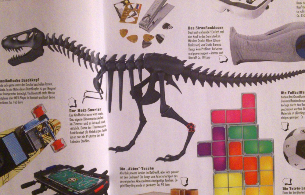 Eine weitere Rubrik aus der ersten Ausgabe hat es ebenfalls wieder ins zweite Heft geschafft: Technische Gimmicks, die man(n) zwar nicht braucht, aber dennoch ganz witzig sind. So wird eine Heizung in Form eines Tyrannosaurus Rex, ein Plektrum Locher oder auch Tetris-Lampenwürfel vorgestellt.