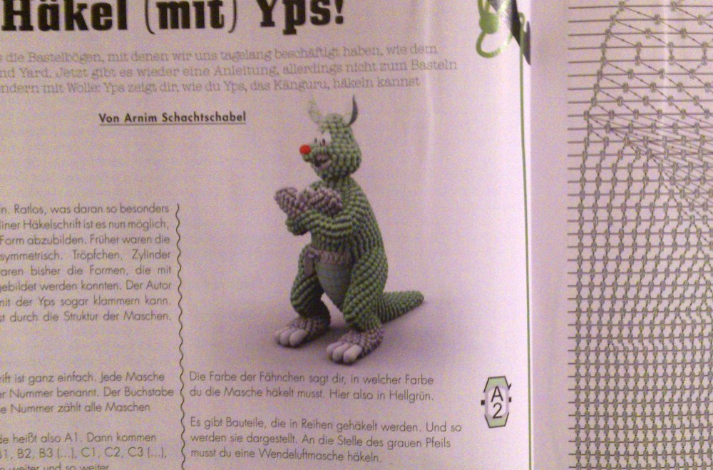 Ebenfalls neu ist eine ganz besondere Bastelanleitung. Denn diesmal darf YPS, das Känguru gebastelt werden. Aber nicht etwa aus Papier oder Pappe, sondern aus Wolle. Die Anleitung ist nämlich eine Häkelanleitung um sich selber ein Plüsch-YPS herstellen zu können.