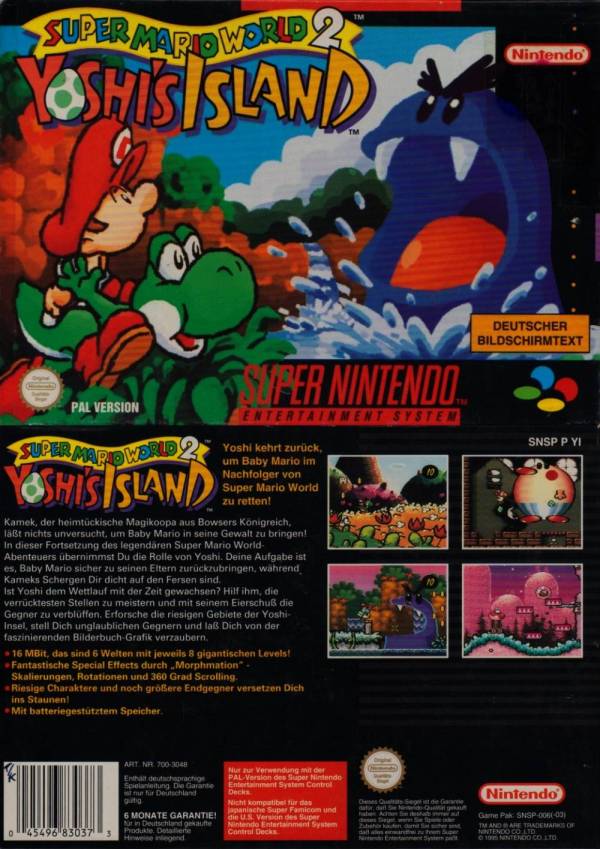 „Super Mario World 2: Yoshi’s Island“ ist ein Klassiker der Videospielgeschichte. Aber nicht etwa nur weil es ein typisches Mario-Jump’n’Run ist, sondern weil es neue Elemente und ein einzigartiges Design im Gepäck hatte. Die Grafik im Kinder-Bilderbuchstil verblüffte damals schon viele Fans und Kritiker gleichermaßen. Die Hintergründe waren liebevoll animiert und ständig in Bewegung. Hinzu kamen (zumindest damals), dank einiger verbauter Special-Chips, atemberaubende Special Effects wie „Morphmation“-Skalierungen, Rotationen und 360 Grad Scrolling in 6 Welten mit je 8 gigantischen Leveln. Yoshi’s Island war mit seinem 16Mbit-Modul schon damals nicht gerade sparsam mit Superlativen. Doch es gab eines, das war noch größer als alle Superlative, mit denen sich Nintendo damals selbst schmückte. Der Spielspaß. Der Spieler steuerte Yoshi durch abwechslungsreiche Levels, immer mit dem kleinen Baby-Mario auf dem Rücken. Und dieser hob den Schwierigkeitsgrad noch einmal gehörig an. Denn wie in späteren Spielen so oft, galt auch hier eine Regel: Pass auf, dass deinem Partner nichts passiert. So musste man nicht nur Gegner plattmachen, ausweichen, Rätsel lösen und Extras einsammeln, sondern auch immer aufpassen, dass einem der kleine Mario nicht abhandenkam, weil sonst eben auch ein Leben futsch war.