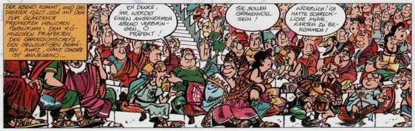 Karikaturistisch wird es aber wieder, als sich das Publikum im Theater in Condate zusammenfindet, wo Obelix einen großen Auftritt haben soll. Dort finden sich mitten in der ersten Reihe, erneut Rene Goscinny und Albert Uderzo wieder, jeweils im Gespräch vertieft. Mit Asterix, Obelix und Idefix stehen immerhin ihre Kreationen auf der großen Bühne.