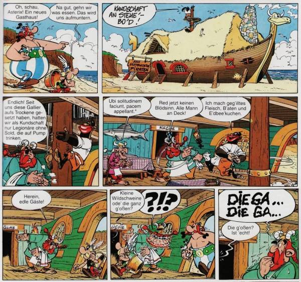 Goscinny zieht mal wieder alle Register und präsentiert einen handfesten Krimi. Diebstahl, Betrug, Wiedergutmachung, echte Freundschaft, Sport, Glücksspiel, Dramatik und ein tolles Finale, einfach alles, was eine gute Geschichte braucht, ist vertreten. Hinzu kommen die üblichen Running Gags (die Gallier treffen auf die Piraten, aber diesmal an Land, Obelix öffnet Türen auf seine gewohnte Art) und ein kleines bisschen Wirtschaftskunde, als Asterix mal so eben die Preise für Wildschweine ruiniert, indem er seine eigenen, die er mit Obelix im Wald gefangen hat, zu Dumpingpreisen verschleudert.