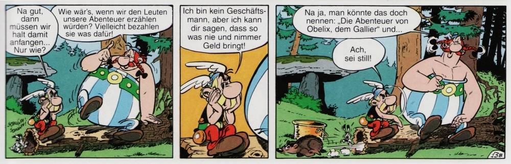 Selbst der Aufbau von „Asterix und der Kupferkessel“ erinnert an ein Theaterstück in mehreren Akten. Mit kurzen, aneinandergereihten Comicepisoden erzählen Uderzo und Goscinny ein urkomisches Abenteuer mit vielseitigen Gags um einen inneren Konflikt. Dass manch einer alles tut um an Geld zu kommen erkennt auch Obelix. Er schlägt doch ganz frech vor, die Abenteuer von sich und seinem Freund niederzuschreiben und zu verkaufen. „Die Abenteuer von Obelix, dem Gallier“ wären bestimmt so interessant, dass die Leute dafür bezahlen würden, was Asterix aber als Unsinn abtut. Hier zeigt sich wieder einmal der typische Humor von Goscinny, mit denen er seine gallischen Abenteuer würzt.