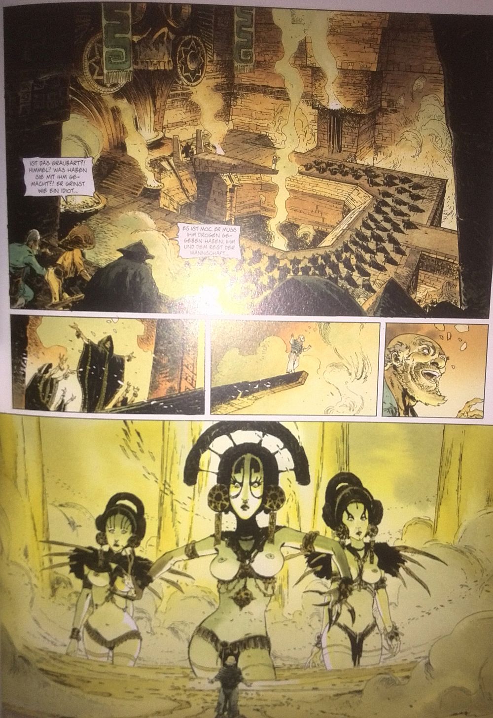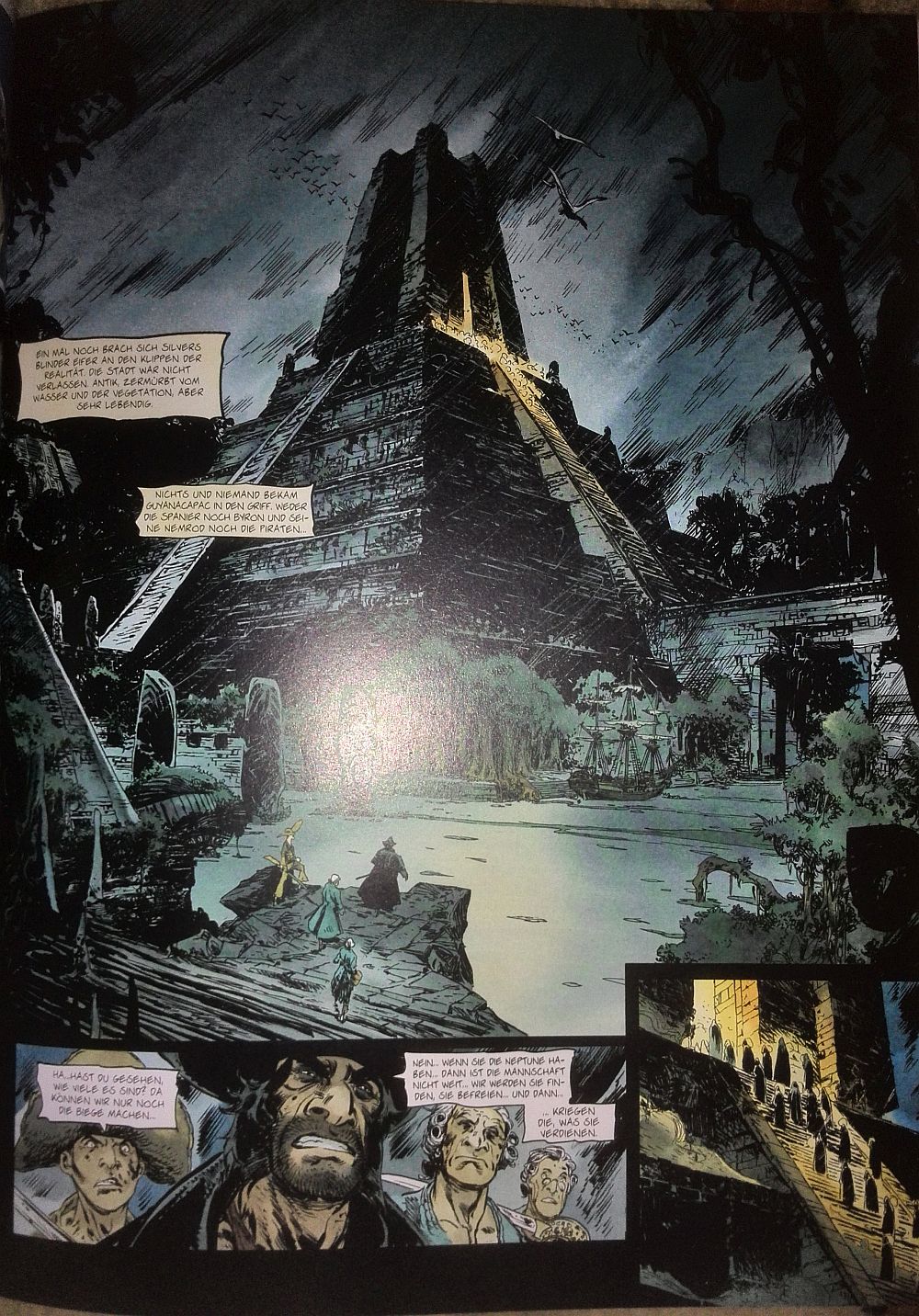 Sehr gut gefällt mir bereits auf der zweiten Seite eine doppelseitige dunkel gehaltene Darstellung von Guyanacapac. Die Stimmung, die durch die Zeichnungen bereits zu Beginn bei mir aufkommt, lassen den Leser wirklich in eine Piratengeschichte im fernen Amazonien eintauchen. Bereits ein paar Seiten weiter, gibt es wieder eine beidseitige große Zeichnung von den Eingängen zu Guyanacapac, die Erste aus der Ferne und die Zweite aus der Nähe dargestellt.