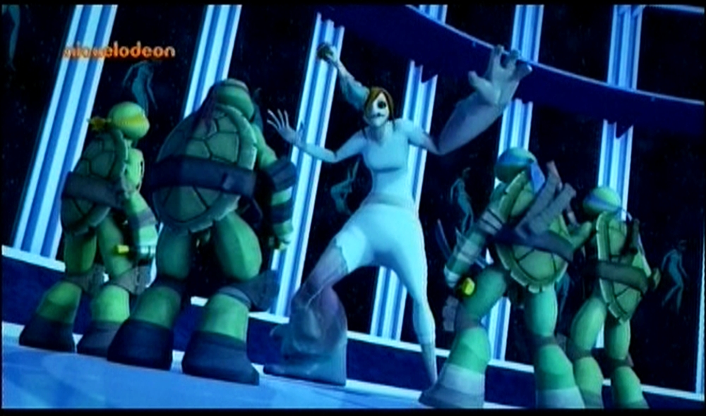 Was gibt es in dieser Folge alles zu sehen? Ehrlich gesagt zu Beginn nicht viel. Alles spielt mal wieder im Dunkeln und auch Leben gibt es in der Stadt wieder nur kaum bis garnicht. Erst als es dann in das TCRI-Gebäude geht, wird es interessant. Neben haufenweise Kraang-Androiden gibt es auch mindestens ebenso viele April-Klone inklusive eines missglückten Klons. Was mir jedoch weitaus besser gefällt als der visuelle Aspekt, ist eine witzige Anspielung von Michelangelo. Diese funktioniert jedoch nur, wenn man auch die originalen Hintergründe kennt. So spricht Mikey von Tofu-Bacon und dass dieser wie echter Bacon schmecken würde. Der Hintergrund dieser Aussage ist, dass der Originalsprecher von Mikey, Greg Cipes, auch Beast Boy in der Teen Titans-Animationsserie gesprochen hat, der dort überzeugter Vegetarier war und sich vorrangig von Tofu-Produkten ernährt hat.