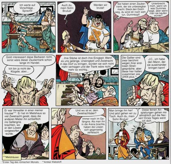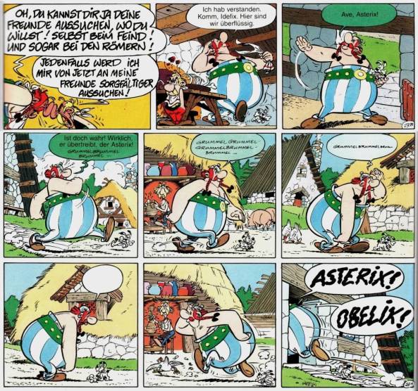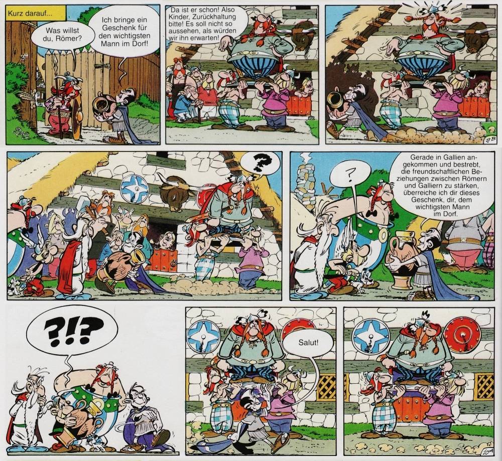Dieser Streit und die Unruhen im Allgemeinen brachten Goscinny dazu, auch die Gallier in ein solches Abenteuer zu stürzen. Er arbeitete eine pointierte Geschichte aus, und beleuchtete somit viele der etablierten Figuren charakterlich neu. Er begann, seine Helden menschlicher zu gestalten. Ein Spiegelbild der Ereignisse dieser Zeit. Unterstütz wurde die gereizte Stimmung im Dorf und auch Drumherum, durch den geschickten Einsatz von grün unterlegten Sprechblasen. Eine Szene zeigt diesen Einsatz besonders gut. Als Asterix und Obelix sich streiten, verlässt Obelix gemeinsam mit Idefix deren gemeinsame Hütte. Seine Sprechblase ist dunkelgrün verfärbt. Man spürt förmlich die Wut. Doch mit jedem Schritt und jedem Panel wird das „grummelbrummel“ kleiner und das grün heller, bis seine Wut nach drei Panels mit einer weißen und vollkommen leeren Sprechblase komplett verraucht ist. Hier sieht man wie gut es das Team Goscinny und Uderzo schaffen eine eigentliche Kleinigkeit so zu stilisieren, dass es schon wieder etwas Außergewöhnliches und sehr originell ist.