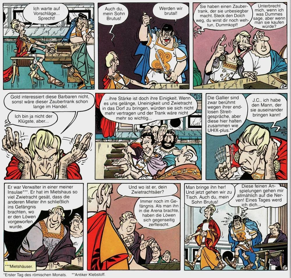 Wie bereits in der Einleitung beschrieben basiert die Grundidee auf den Ereignissen des Mai 1968 sowie der angespannten Situation in der Pilote-Redaktion. Trotzdem erschafft Goscinny weitaus mehr als nur ein reines Ablassventil für seine Frustrationen. Er schreibt eine Geschichte mit viel Humor und Wahrheit, die auch heute noch aktuell ist. Dabei lässt er es sich, wie so oft, nicht nehmen bekannte Dinge einzubauen. Er lässt Cäsar seinen Sohn Brutus, durch die Verwendung des Satzes „Auch du mein Sohn Brutus.“ so nerven, dass dieser fast schon aggressiv wird. Auch verbietet er ihm das Spielen mit dem Dolch, da er sich sonst noch wehtun würde. Eine sehr gute und vor allem witzige Szene, die Uderzo hier von Goscinny umgesetzt hat. Am besten ist jedoch wie Goscinny es schafft Destructivus mit wenigen Worten so agieren zu lassen, dass seine Umwelt genauso reagiert, wie es der kleine Manipulator möchte.