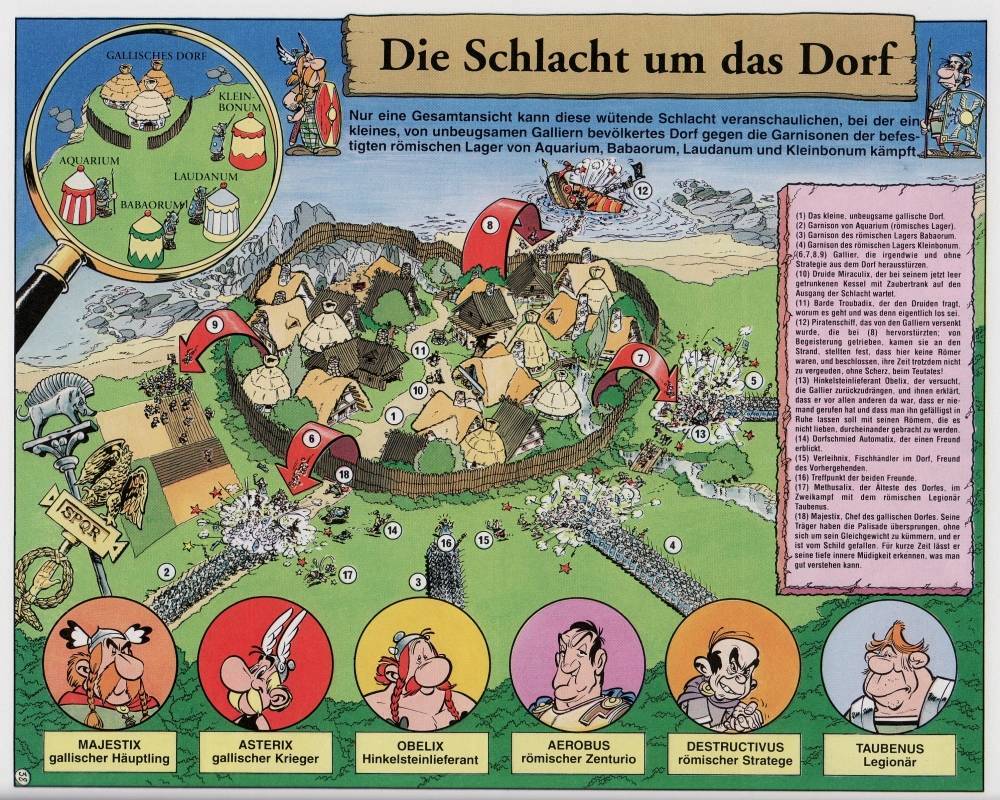 Auch zeichnerisch bietet der Band erneut beste Unterhaltung. Die bereits in der Einleitung erwähnte Einfärbung der Sprechblasen ist dabei nur ein kleiner Teil. Neben den bereits etablierten dynamischen und sehr detaillierten Bildern hat es erneut ein französischer Schauspieler in das Asterix-Abenteuer geschafft. Die Rede ist hierbei von Lino Ventura der in der Rolle des eher zögerlich agierenden Caius Aerobus, dem Zenturio des Lagers Aquarium, zu sehen ist. Wie so oft wird aber auch diese Abenteuer mit einer schematischen Zeichnung ergänzt. Hier wird der Kampf der Gallier gegen die Garnisonen der Lager Babaorum, Aquarium, Kleinbonum und Laudanum sehr übersichtlich und mit viel Humor dargestellt.