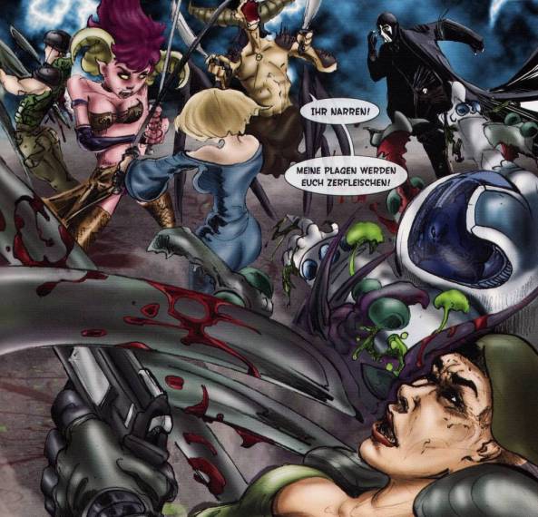Wenn ein Independent-Verlag in Deutschland seit bereits zehn Jahren existiert und sich auch noch gegen die immer stärker werdende Konkurrenz zu behaupten weiß, dann ist das schon ein Grund zum Feiern. Das dachte sich auch Sebastian Schwartzbold und trommelte die Erfinder der drei Topserien des Verlages zusammen, um etwas zu schaffen, dass dieses Jubiläums würdig ist. Das Ergebnis ist diese Mischung aus Fantasy, Action und Endzeitszenario, welches aus der Feder von Robert Heracles stammt. Dieser hat bereits den Roman Nam-Tech sowie die Comics Noli Me Tangere, Son of the Sun und Aquatic Empire verfasst. Außerdem hat er auch mit Tomppa an dessen Councelor (der aktuell auf drei Ausgaben angelegt ist) gearbeitet und übernimmt ab der vierten Ausgabe auch die Geschicke von Tomppas Engel. Die Geschichte selbst ist nicht außergewöhnlich, kann aber dennoch fesseln, wenngleich man schon merkt, dass sie hauptsächlich dazu dient, alle drei Hauptserien des Verlages miteinander zu verknüpfen. Dennoch finde ich es ganz witzig, dass auch der Verleger eine nicht gerade unwichtige Rolle in diesem Ränkespiel erhalten hat. Doch über das große Finale will ich hie natürlich nicht zu viele Worte verlieren, dies muss man schon selbst lesen, um es in ganzen Zügen genießen zu können.