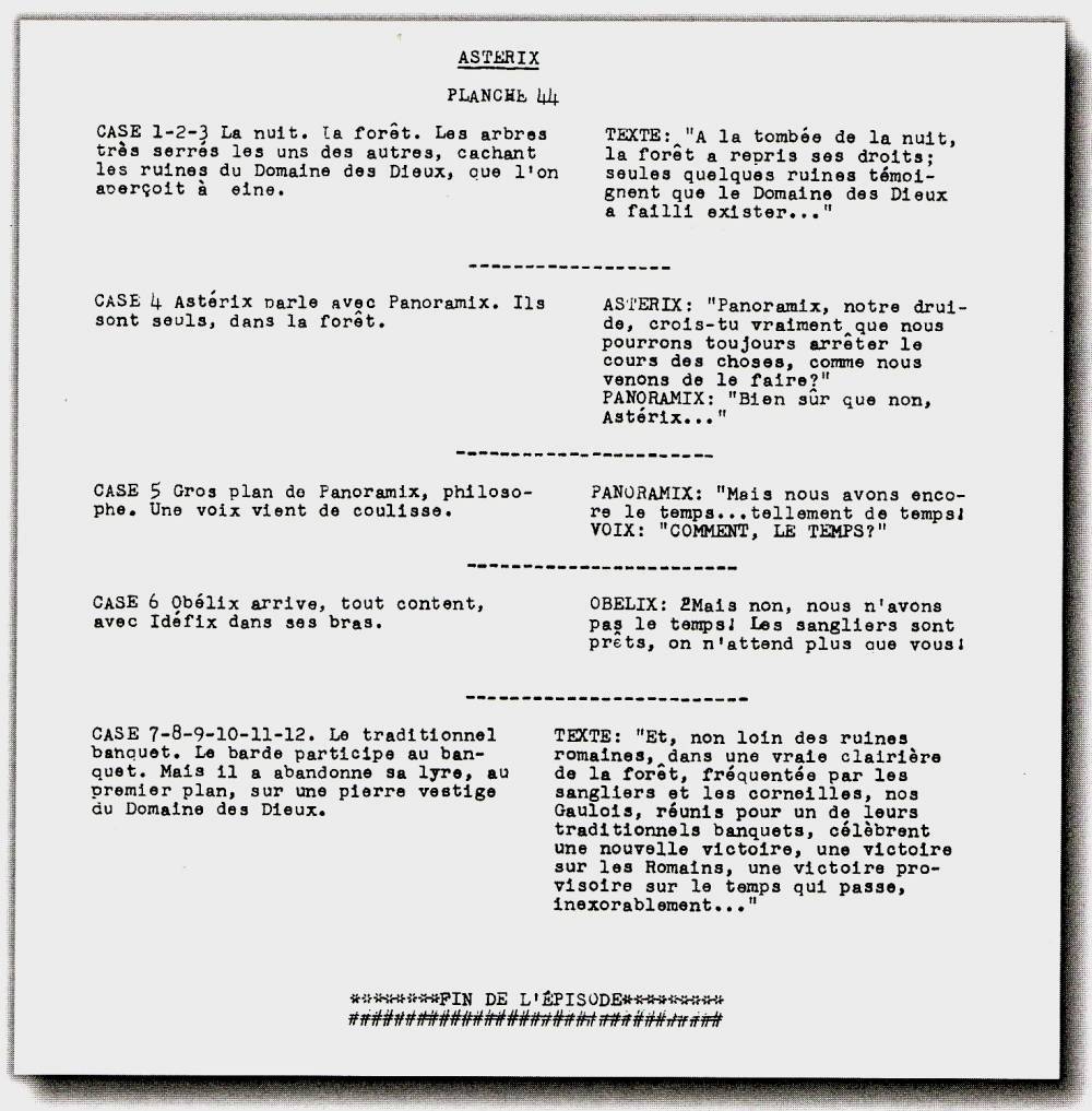 Wie so oft fertigte Goscinny auch für dieses Abenteuer erst kurze Exposés an, in denen er die Geschichte grob umriss, die Handlung und Reaktionen festlegte. So entsteht für jede Seite ein kurzer Absatz, mit allen wichtigen Merkmalen und je nachdem, wie viel auf dieser Seite passiert, fällt dieser Text mal kürzer und mal länger aus. Da diese Texte nur für Goscinny selbst und gelegentlich für das Auge von Uderzo gedacht sind, gibt es hier und da auch kleinere oder größere unschöne Korrekturen.