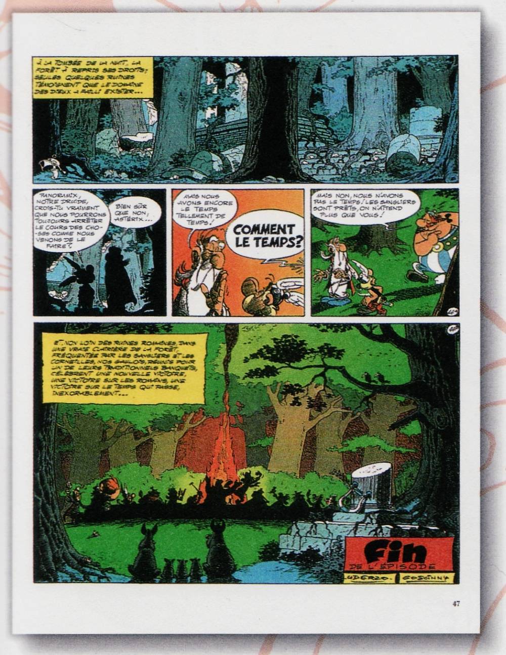 Anders hingegen sieht es dann schon mit dem endgültigen Szenario aus, welche Goscinny für Uderzo anfertigt. Hier befinden extra für jede Comicseite sich auf der linken Seite die Bildbeschreibungen für jedes einzelne Panel und auf der rechten Seite die Dialoge und welchen Figuren sie zugeordnet werden sollen. Ein sehr schönes Beispiel liefern hier die drei Bilder, welche einmal das Exposé zeigen, dann das endgültige Manuskript, nach dem Uderzo arbeitet und zum Schluss die finale Seite inklusive aller Farbgebungen und Texte.
