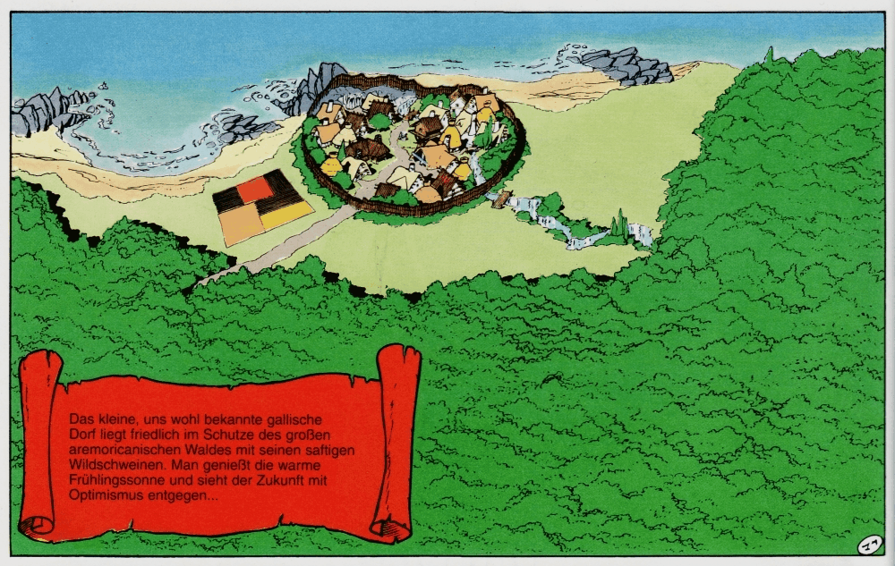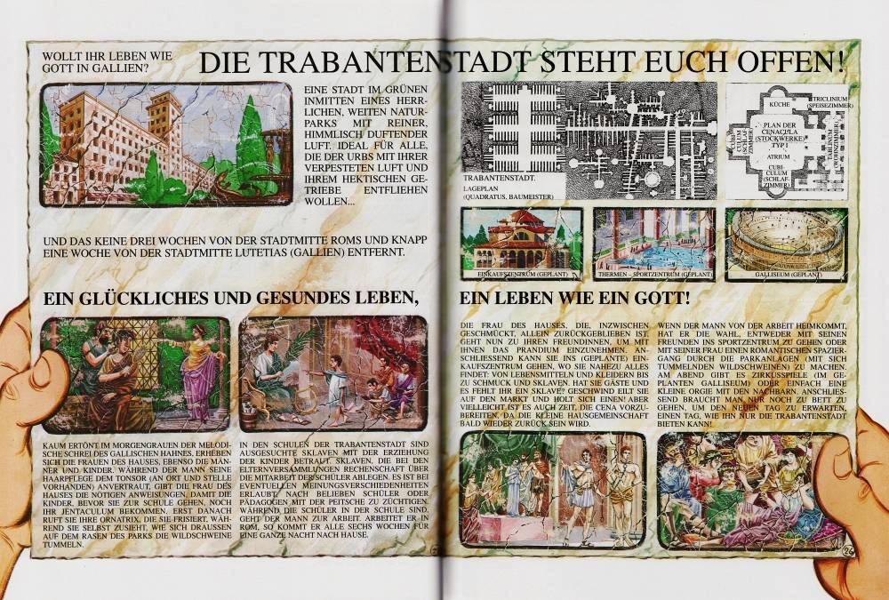 Rene Goscinny kreiert erneut eine Geschichte in der Zwietracht und gegenseitiges Misstrauen im Vordergrund stehen. Hauptelement um dies zu erschaffen ist die Erweiterung des Herrschaftsgebietes von Cäsar, was Goscinny mit dieser Trabantenstadt versucht. Gleichzeitig ist es auch eine Beobachtung der aktuellen zeitgenössischen Entwicklungen, in denen Ballungsräume immer weiter wachsen und kleinere Gemeinden als Vororte einverleiben. Außerdem offenbart Goscinny mit einem Augenzwinkern das bereits die Römer so bekannte Gebäude wie das Einkaufszentrum (hier im Band als Kauf-Domus bezeichnet), ein Parkhaus (Fahr-Rein) und weitere entworfen, entwickelt und gebaut haben sollen. Auch die Art und Weise wie sich das Dorf durch die „einfallenden“ römischen Nachbarn entwickelt, zeigt Goscinny sehr genau auf. Automatix wird vom Schmied zum Antiquitätenhändler und Verleihnix‘ vergleichsweise günstige Fische, werden ihm von den römischen Gästen aus den Händen gerissen, da die Preise in Rom wesentlich höher sind, als hier „auf dem Lande“. So verkommt das gallische Widerstandsdorf zum Budenzauber, mit vielen Fisch- und Antiquitätenständen, wo sich alle gegenseitig Konkurrenz machen.