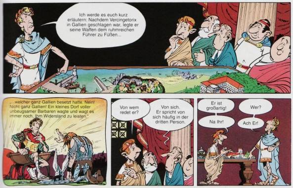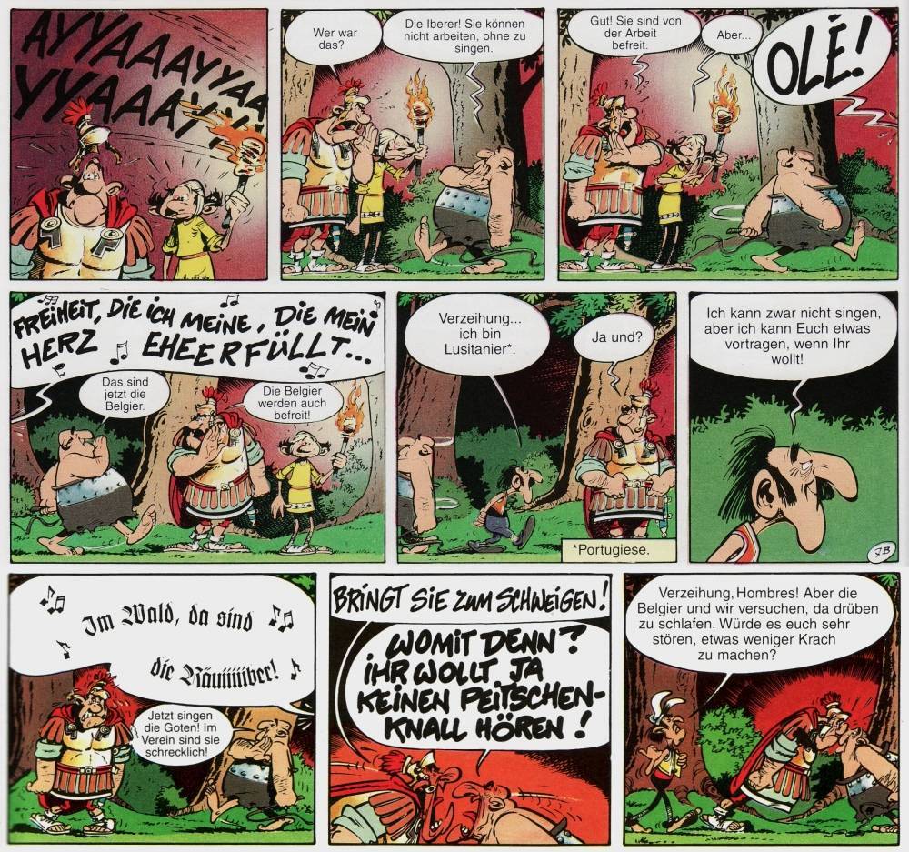 Im direkten Vergleich mit dem Vorgänger „Asterix bei den Schweizern“ fällt dieser Band insgesamt ein wenig zurück, auch wenn er sehr viele gute Momente hat. Dennoch wirkt manches innerhalb der Geschichte etwas unausgewogen und so bleibt ein gelungenes, witziges und vor allem unterhaltsames Abenteuer, das erneut zeigt, wie stark die Gallier sein können, wenn sie gemeinsam auftreten und der Tatsache, dass sie einen Sieg erneut dem Barden Troubadix verdanken, wie bereits in „Asterix und die Normannen“.