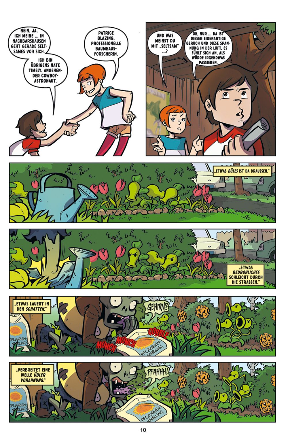 Die Riesenzombies, die auch im Spiel schwer zu besiegen sind, Dr. Zomboss der Anführer, oder Deppie Dave (es kann ihn nur seine Nichte Patrice richtig verstehen), der spricht wie in den Spielen, alle sind mit von der Partie. Beinahe jeder Zombie und jede Pflanze, die man spielen kann, verewigen sich hier im Comic. Das beinhaltet natürlich ein absolutes Gewusel zwischen Pflanzen und Zombies. Viele Panels sind entsprechend prall gefüllt, und mittendrin Deppie Dave, Patrice oder Nate Timely. Der Leser sollte sich für alle Anspielungen die Panels genauer ansehen, sonst übersieht man schnell einen Zombie oder eine bekannte Pflanze.