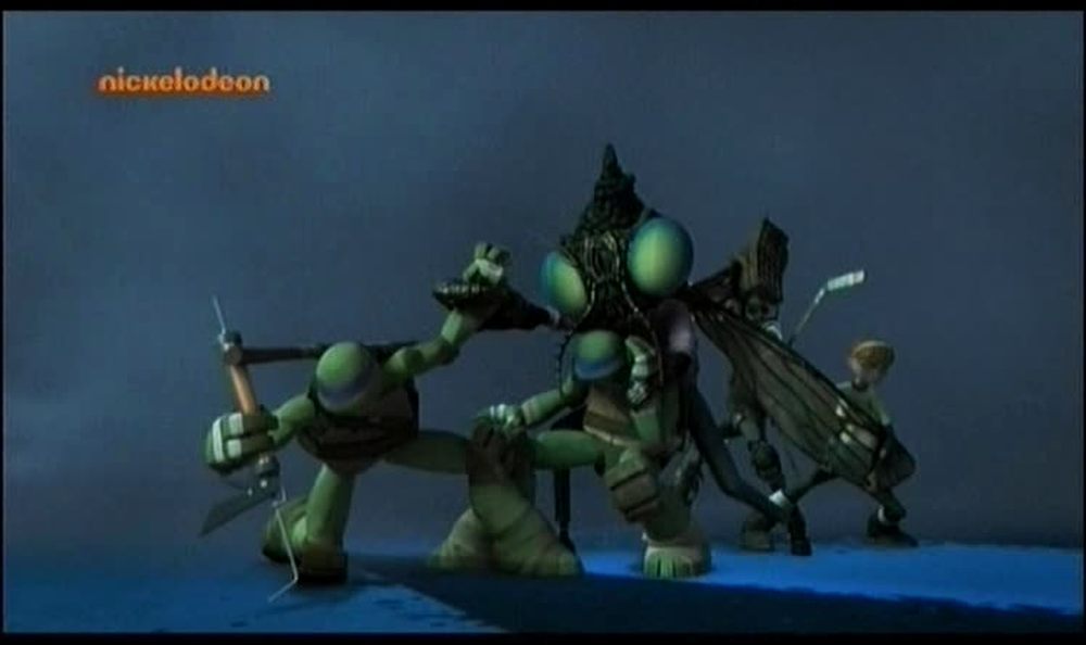 Ein weiterer Punkt neben dem Versuch Aprils Vater seine Menschlichkeit wiederzugeben, ist auch die Chance für Splinter seine natürliche Gestalt zurückzuerlangen von großer Wichtigkeit, zumindest für Donatello. Aus 10 Kanistern Mutagen und in monatelanger Arbeit hat es der schlaue Turtle geschafft gerade einmal 2 Anwendungen des Retro-Mutagens herzustellen. Eine für Kirby O’Neill und eine für Master Splinter. Doch dank Baxters auftauchen hat sich diese Chance relativiert und am Ende steht sogar Kirbys Rückverwandlung auf dem Spiel. Wirklich spannend ist das zwra nicht, denn viel zu vorhersehbar sind die einzelnen Abschnitte dieser Folge. Dennoch kommt keine Langeweile auf, da die gesamte Inszenierung sehr gelungen ist. Sieht man von der üblichen Dunkelheit der ganzen Szenarien und der lieb- sowie leblosen Stadt ab, wird immer noch solide Turtes-Action geboten, die wieder mit dem bekannten Michelangelo-Humor aufgepeppt wird. Wenn ich ehrlich bin, kann ich mir die Szenen mit Michelangelo als Tur-Fly-tle und Raphael nicht oft genug ansehen. Nicht nur, dass man sich beim Szenenwechsel mit dem Tur-Fly-tle Symbol an der Batman-Serie der 60er Jahre bediente, auch die üblichen Streitereien zwischen den Beiden ist immer wieder einen Lacher wert. Erst recht als Tur-Fly-tle Raphael zu seinem Sidekick, dem Maden-Mann, macht.