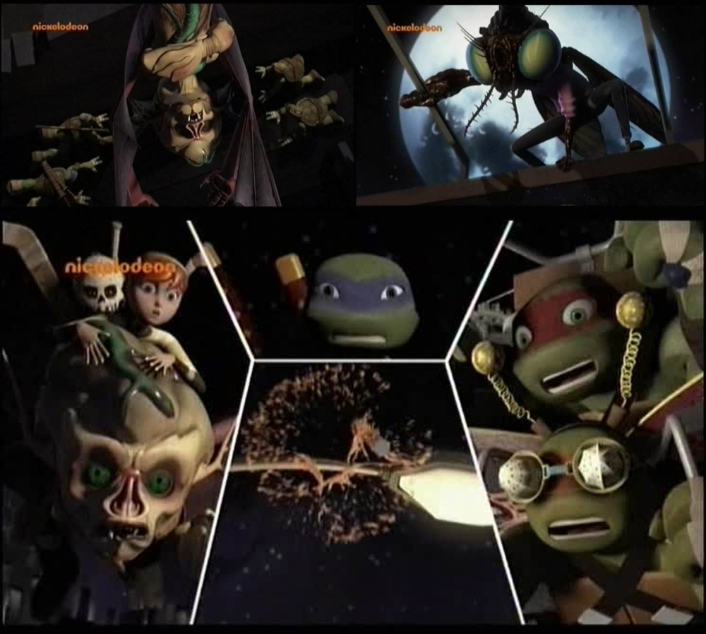 Nichts, und deswegen taucht ein weiterer alter Bekannter aus der Versenkung auf. Gemeint ist hier Baxter Stockman, der nun, wie auch schon in der klassischen Animationsserie, in eine Fliege mutierte und ebenfalls auf der Jagd nach dem Retro-Mutagen ist. Inhaltlich haben sich die Macher also erneut an der Serie aus den 80er Jahren orientiert, und abermals wurde das Design angepasst, wodurch Baxter visuell bei Weitem nicht mehr so harmlos aussieht, wie sein Zeichentrickpendant von 1987. Als sabbernde Monsterfliege ähnelt sein Design stark dem von Jeff Goldblum in David Cronenbergs „Die Fliege“, wobei man sich beim Ekelfaktor ein wenig zurückgenommen hat. Schön sieht es trotzdem nicht aus, wenn Stockman-Fly seine Nahrung per Speichel verflüssigt um sie dann aufzusaugen, was biologisch gesehen zwar korrekt ist, aber …