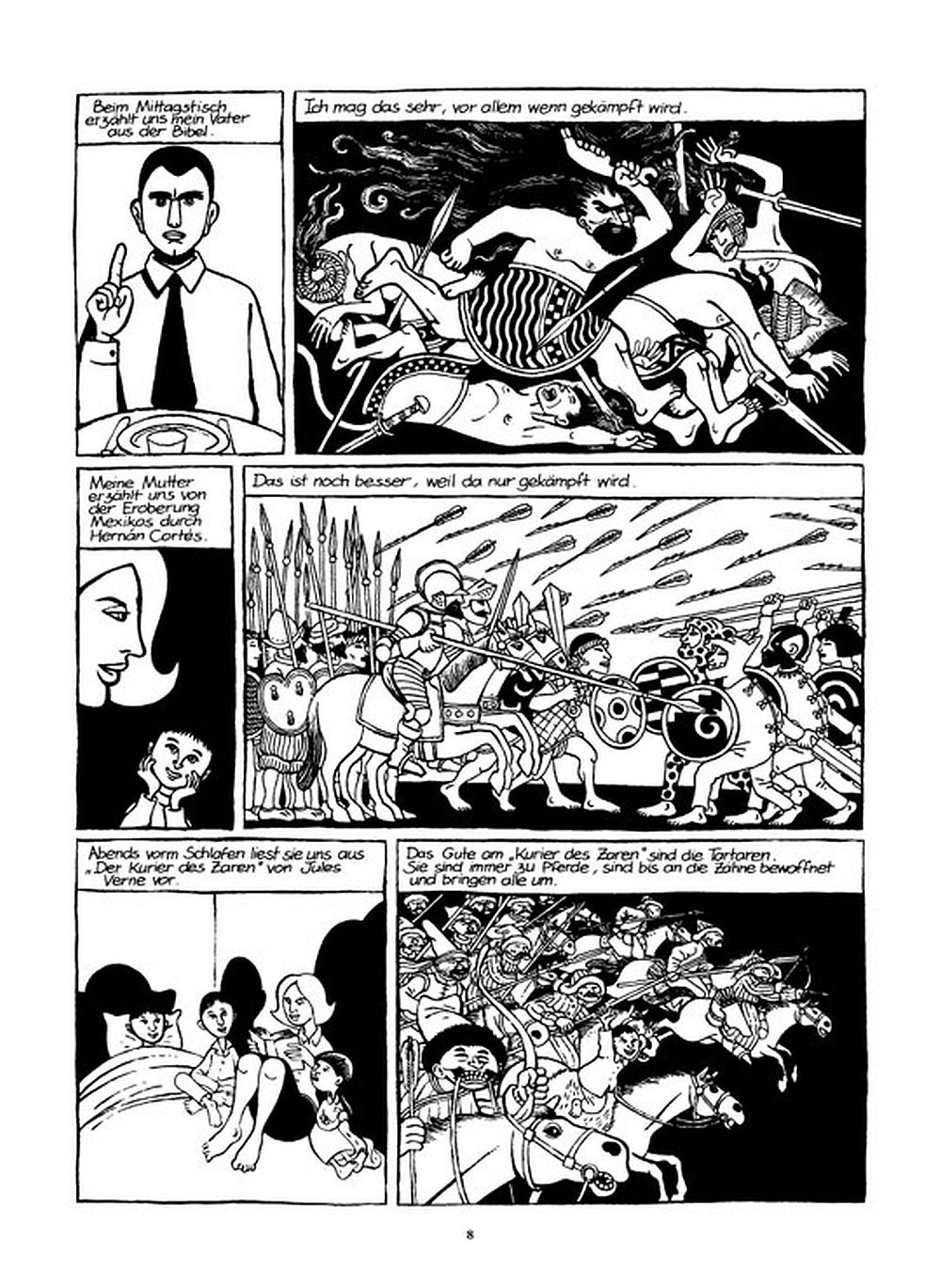 Zeichnerisch sind Kampfszenen sehr beliebt. Allem voran scheinbar Dschingis Khan, der Algerienkrieg und der Erste Weltkrieg. Diese Zeichnungen kommen sehr häufig vor und konterkarieren den ständigen Kampf der Familie gegen die Epilepsie.