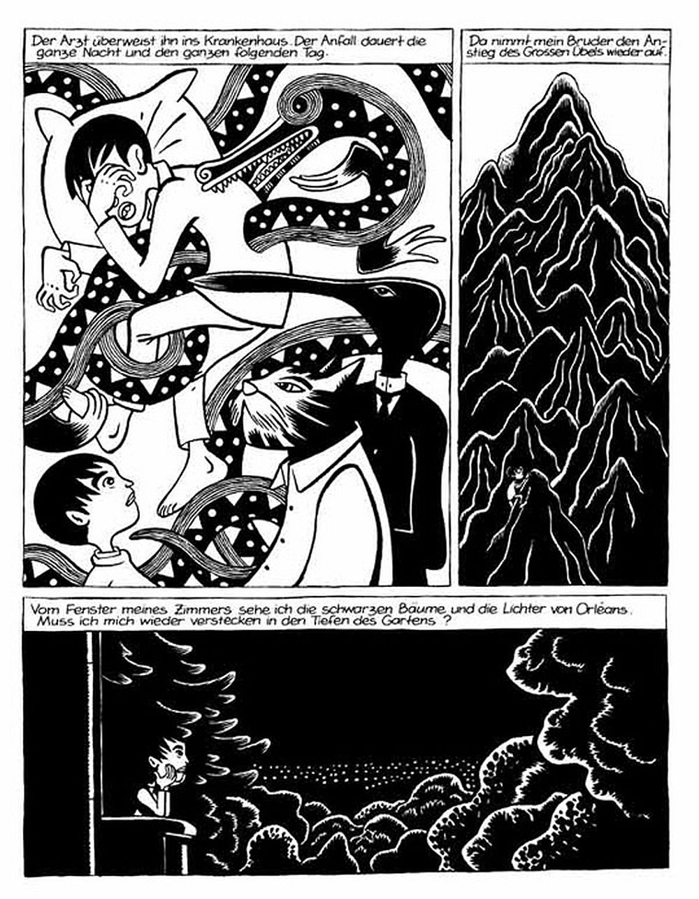 In „Die heilige Krankheit“ schildert er in schonungsloser Offenheit und mit zuweilen bitterbösem Humor seine Familiengeschichte, die durch die schwere Erkrankung seines Bruders geprägt wurde. Die verzweifelte Suche seiner Eltern nach einer Heilmethode führt von selbstherrlichen Fachärzten bis hin zu diktatorischen Esoterik – Gurus. Für David B. ein einziger Albtraum, den er Jahre später in diesem Meisterwerk verarbeitet.
