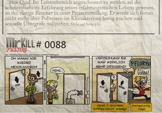 Selbst am Tag der deutschen Einheit liefert Schöpfer Henning Mehrtens einen neuen (alten) Mr. Kill Funnie. Genial wie immer. btw. wie oft wird Horst J. Gonzales eigentlich aufs Korn genommen? 🙂