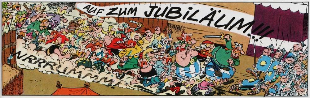 Es ist schon eine Freude zu sehen, wie die Römer immer mehr vor den Galliern kuschen. Zumindest die, welche schon eine Zeit lang um das Dorf stationiert sind. So ergeben sich immer dann, wenn jemand von außerhalb dazustößt, sehr witzige Situationen, die zu sehr unterhaltsamen Dialogen führen. Ebenso witzig sind aber auch die Dialoge innerhalb des gallischen Dorfes, und hier meine ich nicht einmal den um die Frische der Fische, sondern, wie sich die Gäste der Gallier untereinander austauschen und fachsimpeln. Aber auch die alten Greise (darf man das überhaupt noch sagen?) im Dorf von Osolemirnix sind immer wieder für einen Lacher gut, wenn sie von der guten alten Zeit schwärmen und alles von heute blöd finden. Und dann wären da noch die alten Bekannten Piraten, die in dieser Jubiläumsausgabe einen etwas größeren Part zugewiesen bekommen und es sogar mit einem Knall feiern dürfen.