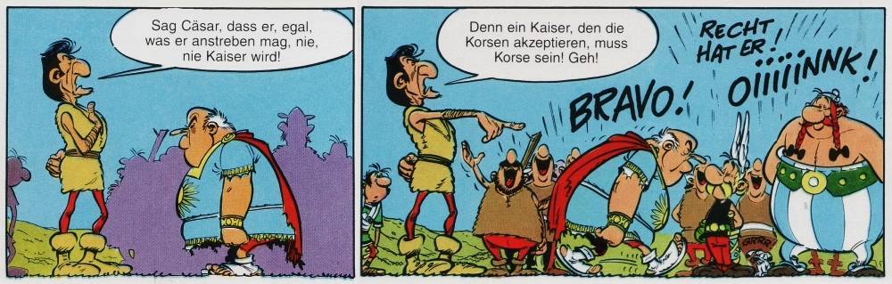 Doch nun zurück zu den Feierlichkeiten der beiden geistigen Väter. Statt der gallischen Karte gibt es diesmal die Karte von Korsika zu sehen und auch die Vorstellung der wichtigsten gallischen Helden wurde gestrichen. An deren Stelle gibt es feierliche einleitende Worte der Autoren. Auch sind diesmal nicht die Erwachsenen jene, welche das Abenteuer einleiten, sondern die Kinder des gallischen Dorfes, die sich aber ganz getreu ihren Eltern verhalten. Mit diesen Bildern starten Goscinny und Uderzo lustiges und dennoch nachdenkliches Abenteuer auf einer fremden, aber trotzdem von den Römern besetzten Insel. Der Insel des Kaisers, Napoleon Bonaparte. Und was darf zu einem Jubiläum nicht fehlen?