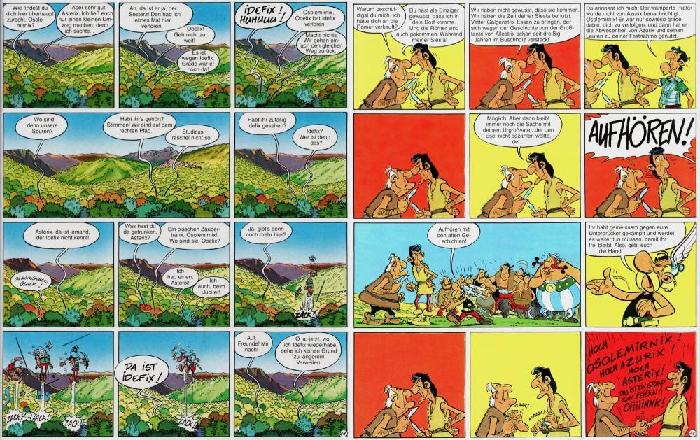Was den Band aber dennoch ein wenig enttäuschen lässt, ist die visuelle Umsetzung. Hier merkt man, dass Uderzo nicht so viel Zeit hatte, wie er es gerne gehabt hätte. Hintergründe sind oftmals nur minimal ausgearbeitet, wenn sie überhaupt vorhanden sind. In den meisten Fällen, vor allem bei Dialogen, füllen nur vollfarbige Flächen die Plätze um die Figuren. Keine Details, einfach nichts gibt es da zu sehen. Es gibt leider nur sehr wenige Panels, in denen die in der Einleitung erwähnte Schönheit Korsikas zu erkennen ist.