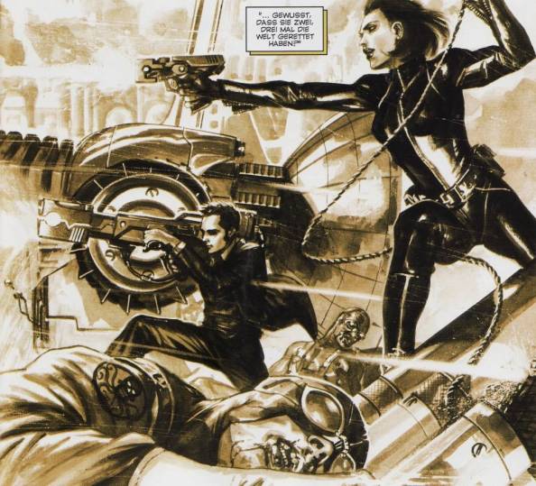 Was dem Band ebenfalls zugutekommt, merklich sogar, ist das wundervolle Artwork von Gabriele Dell’Otto und Werther Dell’Edera. Dell’Otto, der sich Ende der 90er Jahre zu einem Geheimtipp in Europa mauserte, nachdem er mit Titelbildern für Panini in Europa auf sich aufmerksam machte. Inzwischen gehört der gebürtige Italiener zu den ganz großen Comickünstlern, der mit seinen malerischen Bildern einem Alex Ross gleichkommt. Der einzige Unterschied zu Ross ist, dass Dell’Otto wesentlich mehr Dynamik in seinen Bildern unterzubringen weiß. Nichts gegen Alex Ross, ich liebe seine Zeichnungen und Cover für die X-Trilogie (Erde X, Universum X und Paradies X) und viele weitere Miniserien, Events, usw. aber ihm fehlt das Leben. Alles wirkt zwar sehr realistisch, aber eben nur wie ein Standbild. Bei Dell’Otto und Dell’Edera ist dies anders. In deren Bildern liegt Bewegung, Action und Dramatik. Und trotz eines gewissen Fotorealismus sieht man nahezu in jedem Bild die Pinselstriche, was mich selbst hin und wieder dazu verleitet hat, kurz innezuhalten, und die Bilder mit etwas Abstand zu betrachten, damit diese noch besser auf mich wirken konnten. Auch bleibt die Qualität über den gesamten Band gleich und ich selbst kann nicht ausmachen, wo Dell’Otto aufhört und Dell’Edera anfängt. Ein gelungenes Artwork, in sich stimmig und eine faszinierende Zusammenarbeit von zwei sehr außergewöhnlichen Künstlern, die ich immer wieder gerne ansehe.