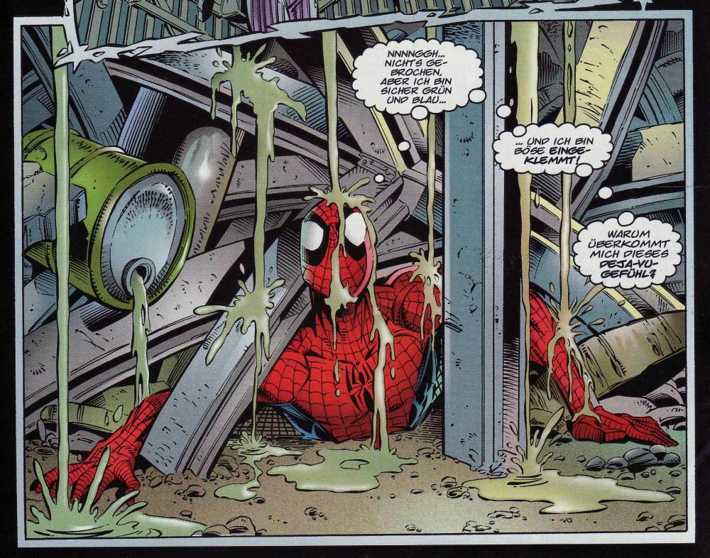 Negativ fallen mir an dem Heft eigentlich nur die etwas hölzernen Übersetzungen von Michael Strittmatter auf. Er macht seine Arbeit sehr gut, und übersetzt auch sehr sinngetreu, aber leider fehlen vielen seiner Texte das Leben. Die Sprache wirkt oftmals streng und wie aus einem Lehrbuch. Und wenn wirklich einmal lockere Szenen kommen, wirkt es fast schon unnatürlich, weil der gesamte Rest so steif scheint. Besonders auffällig ist das bei dem Venom-Abenteuer, und das, obwohl sich hier durch Peters Erkältung einige witzige sprachliche Momente ergeben. Auch Venoms Namensverballhornungen für seinen Erzfeind Spider-Man sind nach dem zweiten, bzw. dritten Mal schon nicht mehr witzig. Dies liegt aber neben Strittmatters Übersetzung auch an Hamas Skript.
